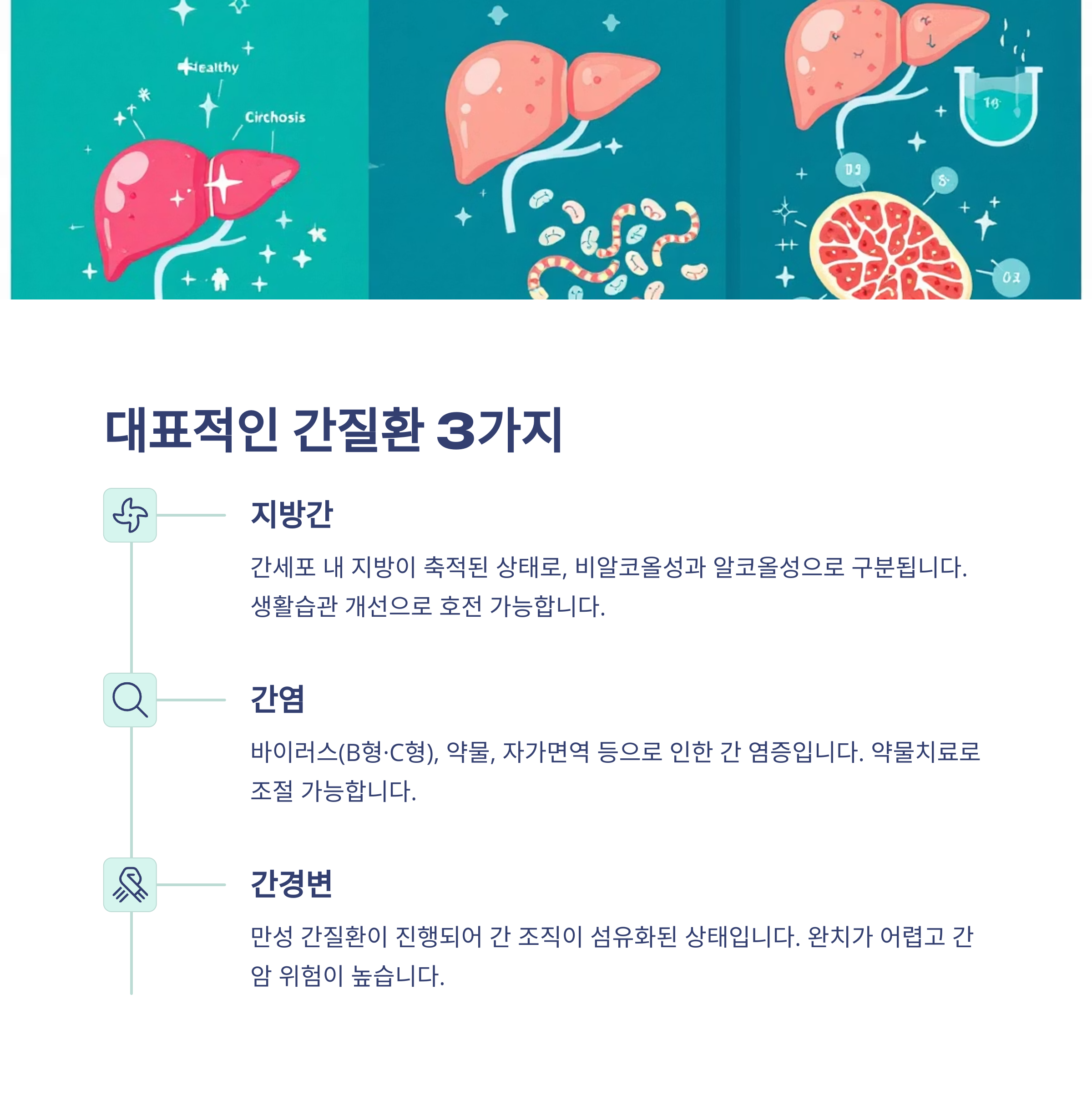 이번 글을 통해 간질환의 다양한 형태와 차이점을 정확히 이해하고, 간 건강을 지키기 위한 실천을 꾸준히 이어가시기 바랍니다.