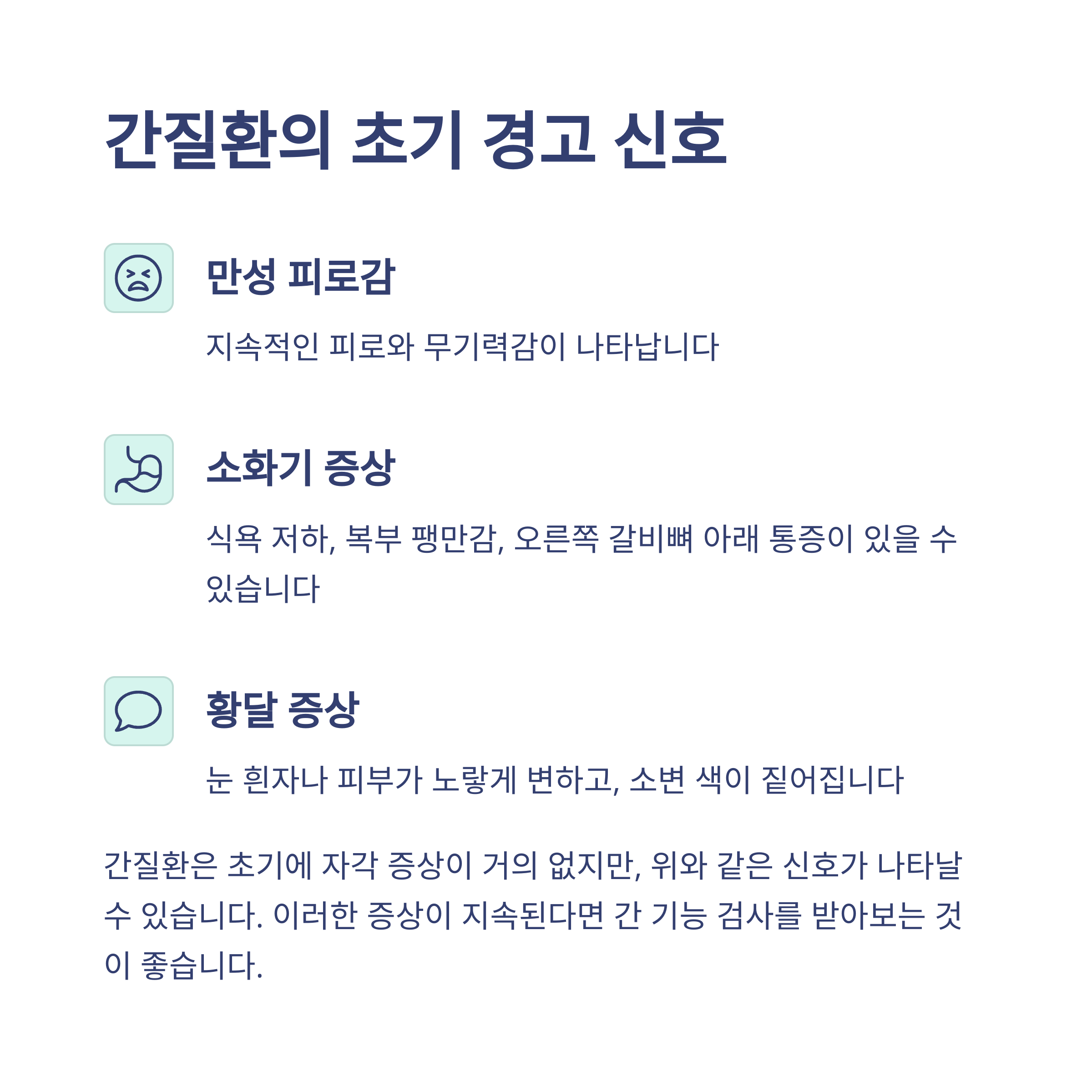 간질환은 초기 자각 증상이 거의 없지만, 다음과 같은 신호가 발생할 수 있습니다.