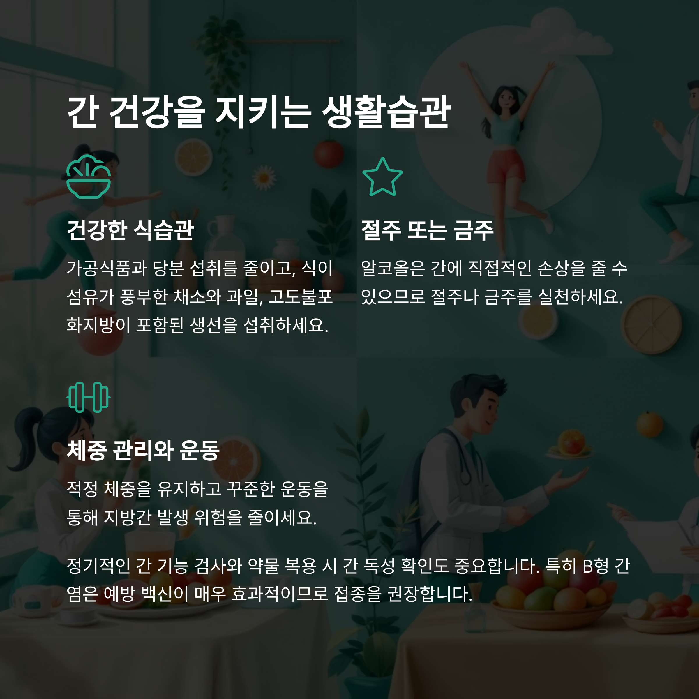 예방 체중 조절, 금주 예방접종(B형), 감염 주의 조기 간염 관리가 핵심
