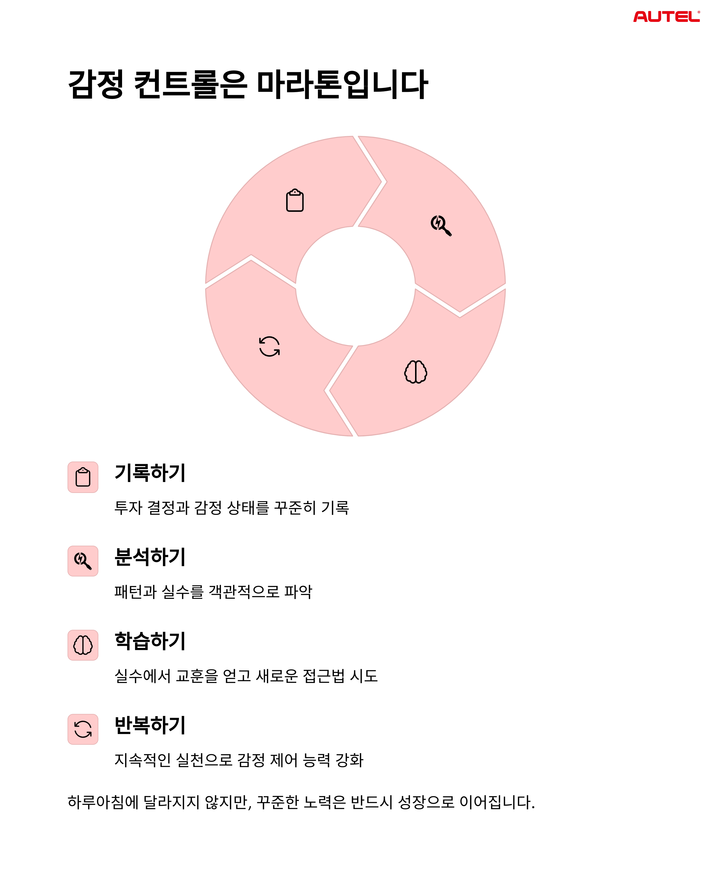 감정 투자에서 벗어나는 길은 단 하나, 기준과 기록을 갖춘 투자 습관입니다. 오늘 나의 매매는 감정이 아니라 전략과 분석을 바탕으로 이루어졌는지 꼭 점검해 보세요. 감정을 통제하는 힘은 한순간에 만들어지지 않습니다. 꾸준한 복기와 실천이 나를 더 단단한 투자자로 성장시킬 것입니다.