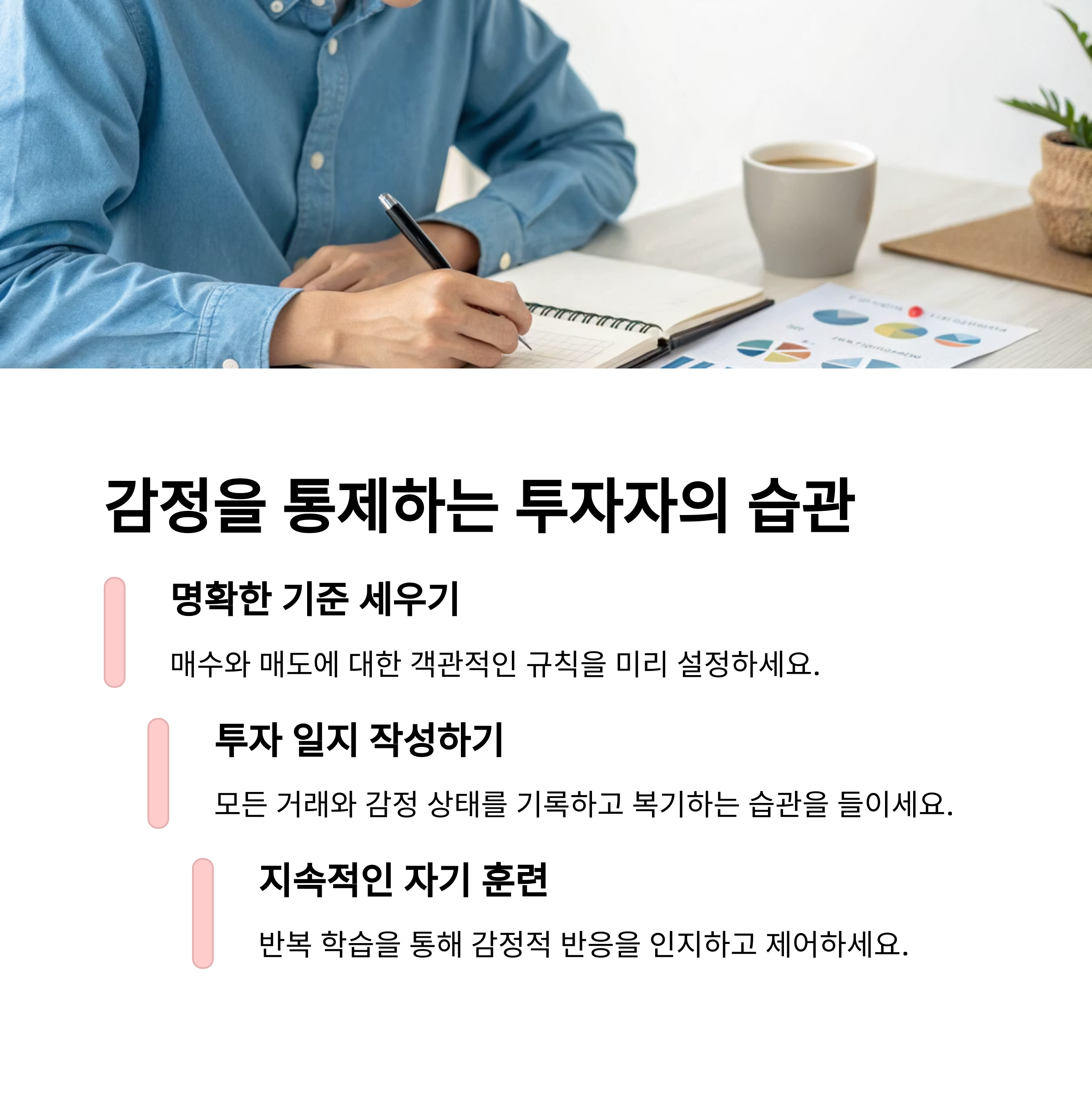 | 공포, 탐욕에 흔들리지 않아야 합니다. | 매수·매도 계획을 미리 세워두세요. | 투자 일지 작성은 습관 개선에 효과적입니다. |