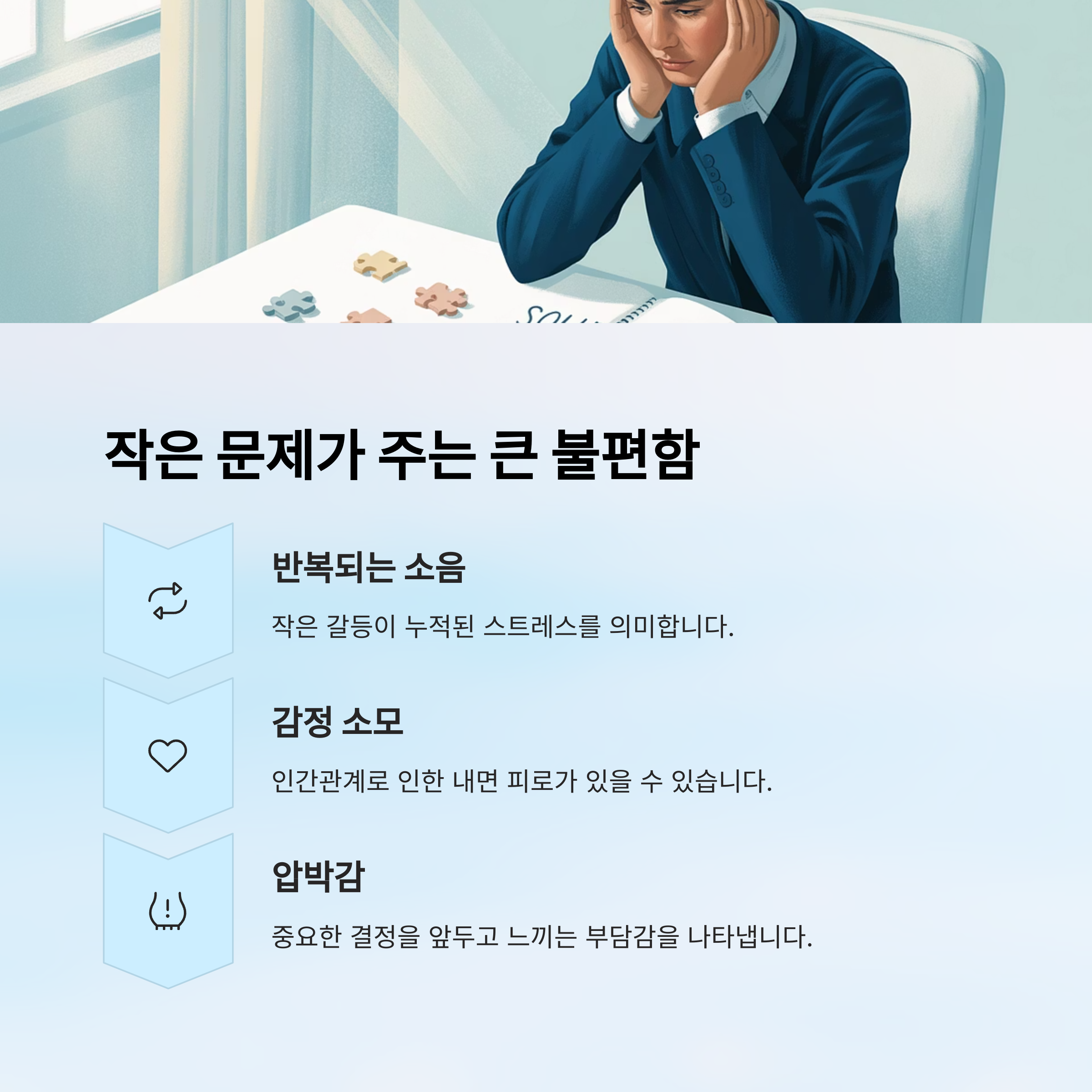 특히 반복되는 업무, 주변 사람들과의 미묘한 갈등, 또는 감정적인 피로가 누적되었을 가능성이 큽니다.