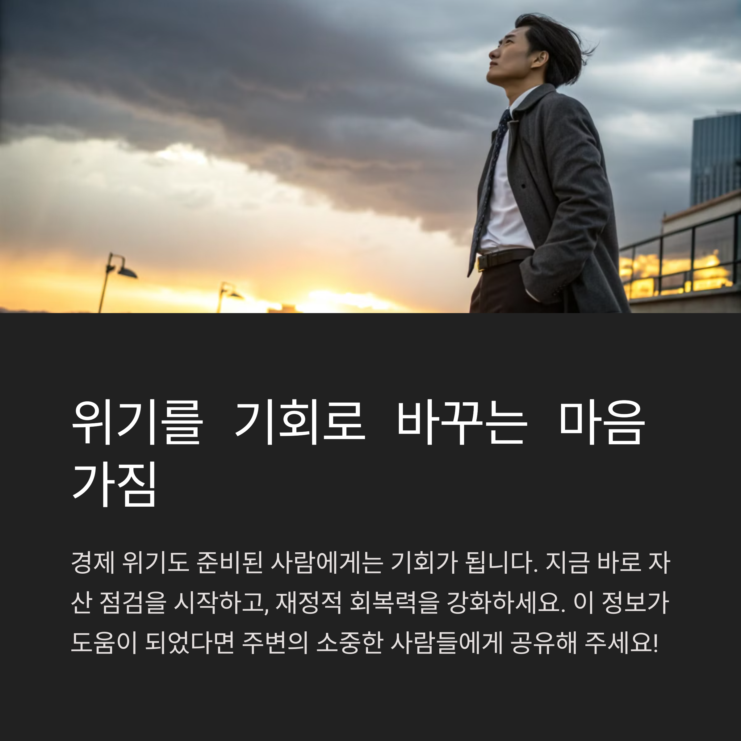 위기의 순간은 두려움이 아닌 기회의 시간이 될 수 있습니다. 단, 그 기회는 준비된 사람에게만 주어집니다. 현금 비중을 점검하고, 비상 상황에 대한 계획을 세우며, 변화에 유연하게 대응하는 습관을 들인다면 어떤 경제 환경 속에서도 흔들리지 않는 자산 관리를 할 수 있을 것입니다. 오늘부터라도 실천해보세요. 여러분의 자산은 스스로 지켜야 하니까요.