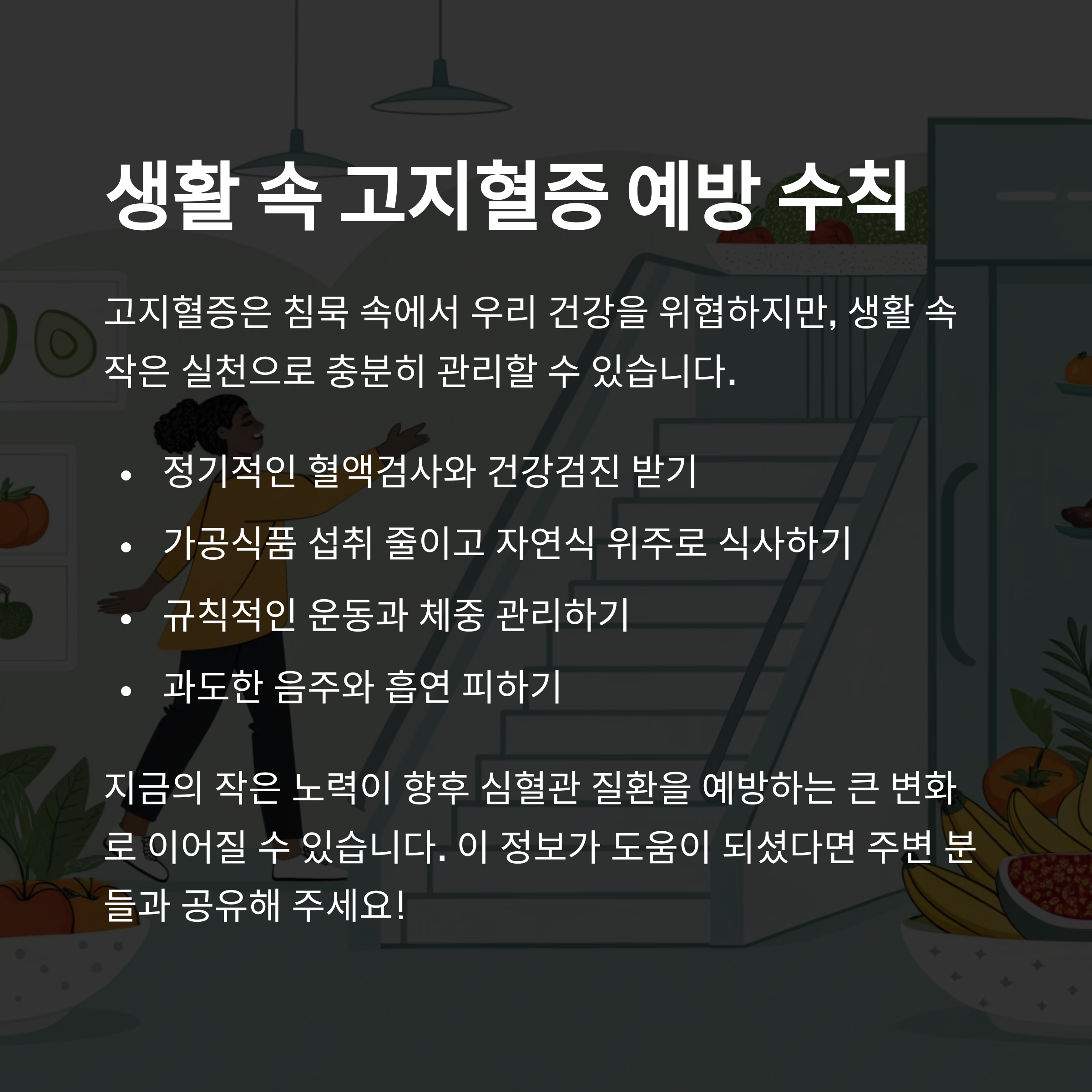 다음은 일상생활에서 실천할 수 있는 고지혈증 예방 수칙입니다.