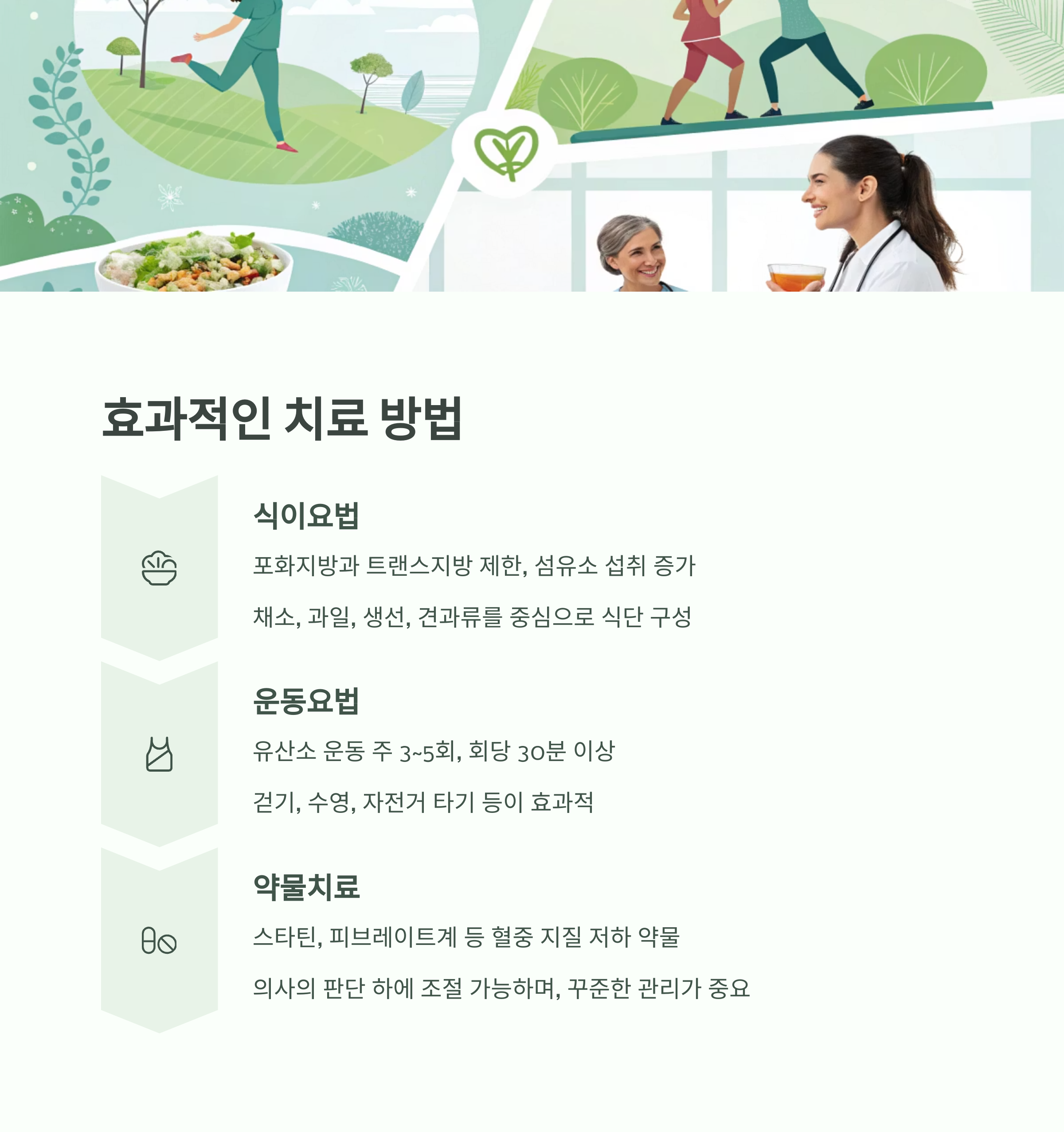 고지혈증 치료는 생활습관 개선과 약물요법이 병행됩니다.