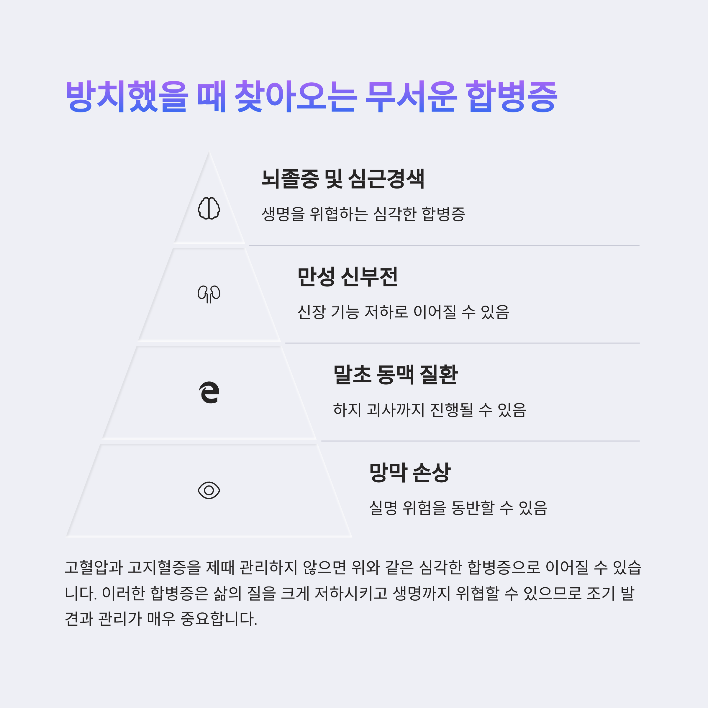 고혈압과 고지혈증을 제때 관리하지 않으면 심각한 합병증으로 이어질 수 있습니다. 특히 아래와 같은 결과를 초래할 수 있습니다.