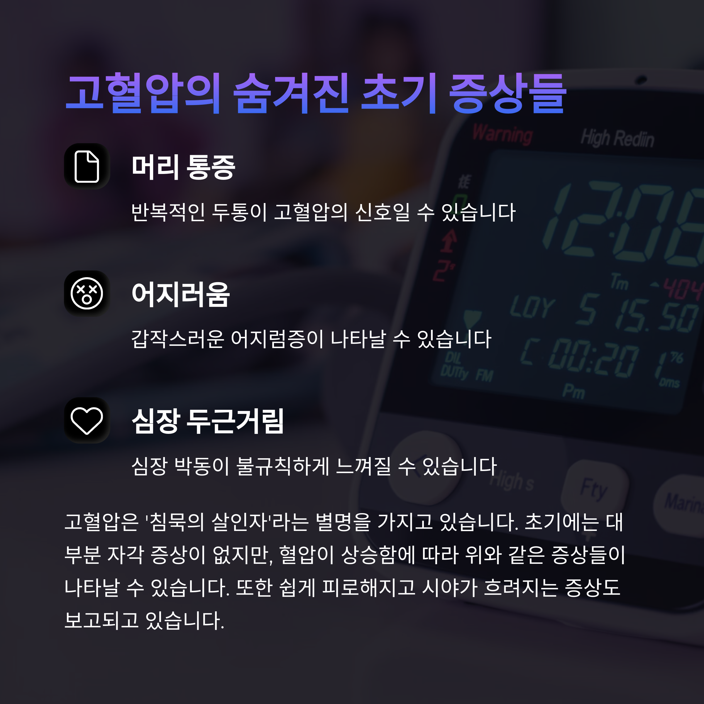 고혈압은 ‘침묵의 살인자’라는 별명을 가지고 있습니다. 초기에는 대부분 자각 증상이 없지만, 혈압이 상승함에 따라 머리 통증, 어지러움, 심장이 두근거리는 느낌이 나타날 수 있습니다. 또한, 쉽게 피로해지고 시야가 흐려지는 증상도 보고되고 있습니다.