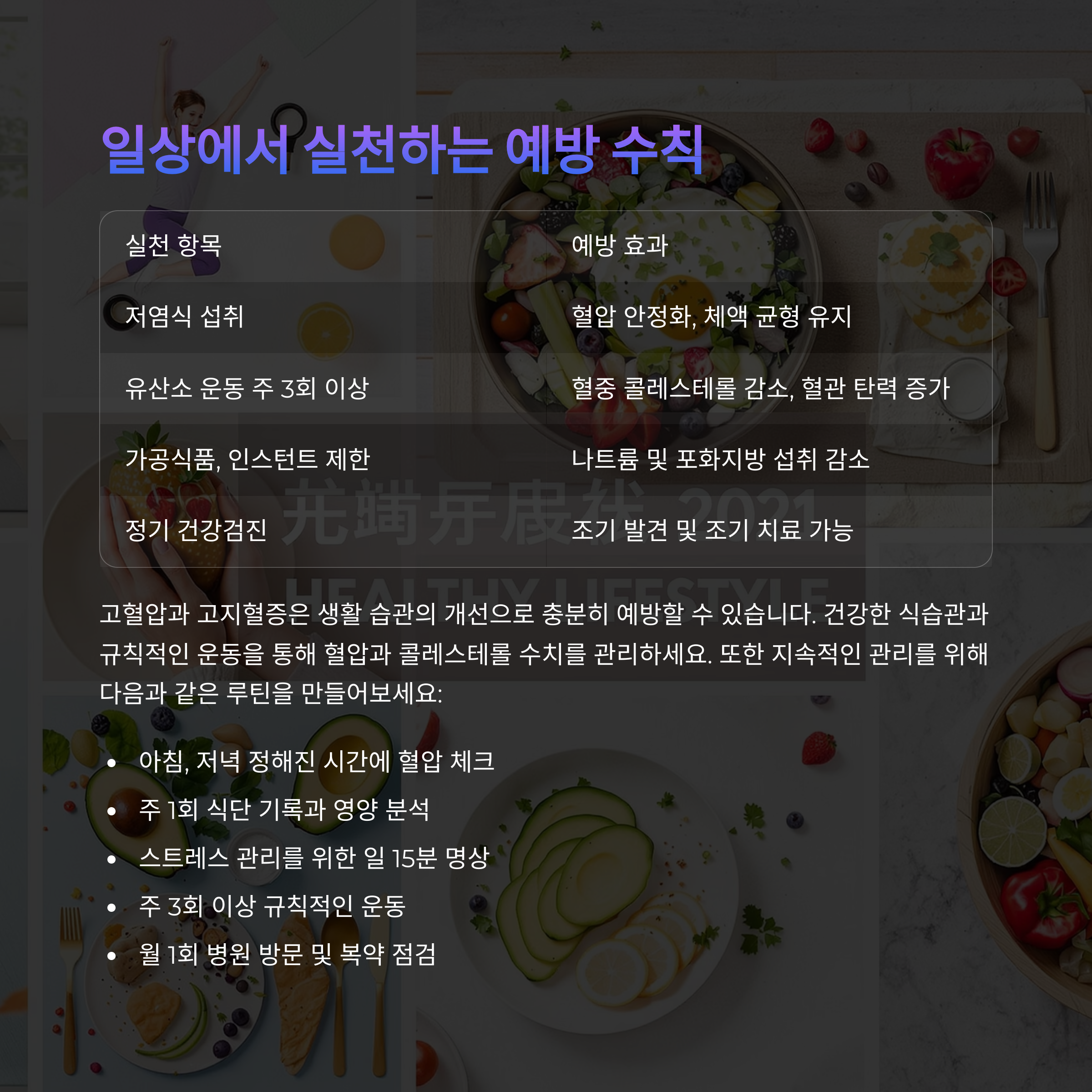 고혈압과 고지혈증 모두 식습관과 운동 등 생활 습관의 개선으로 충분히 예방할 수 있습니다. 아래 표는 일상에서 실천할 수 있는 예방 수칙을 정리한 내용입니다.