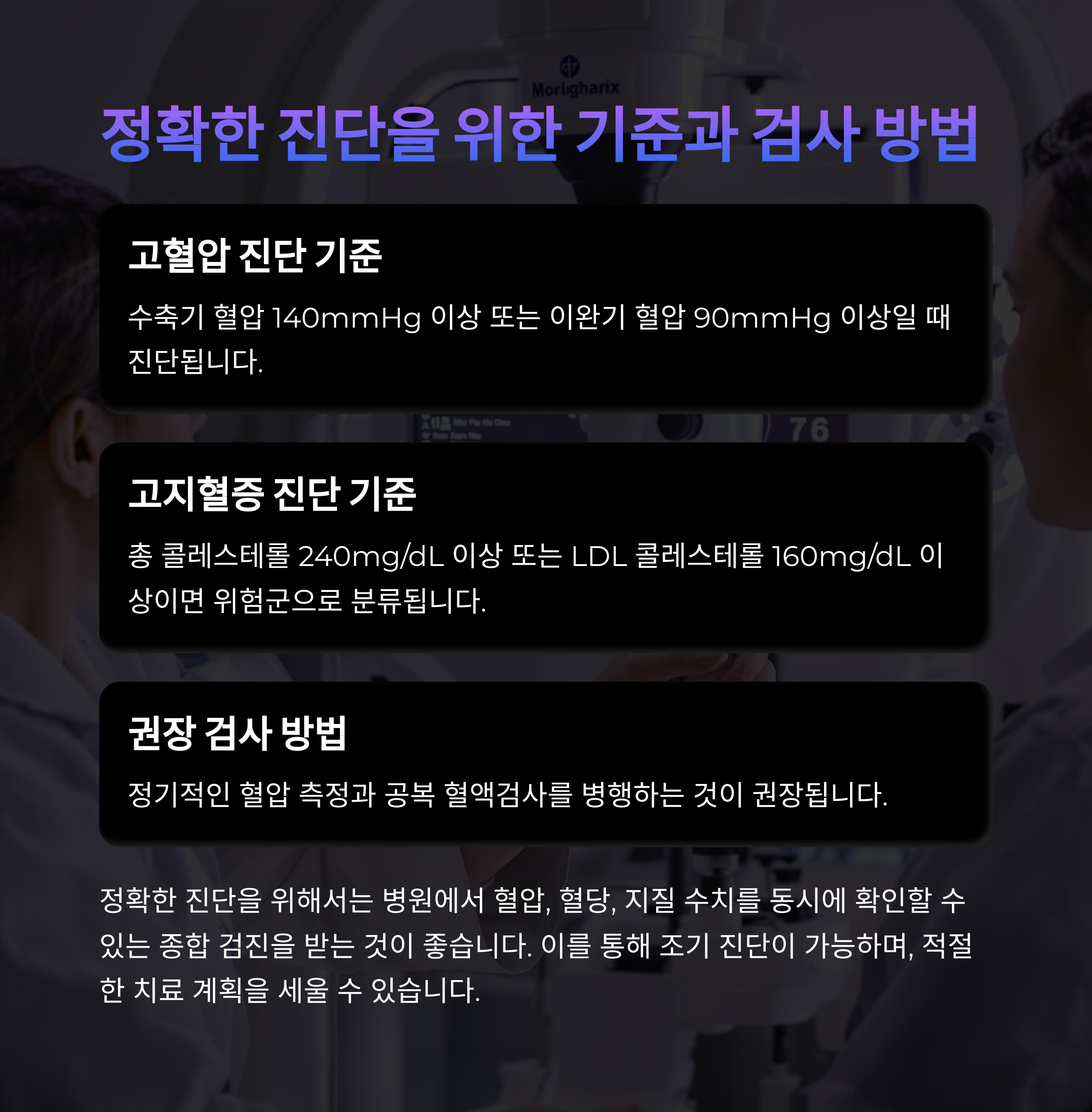 고혈압은 일반적으로 수축기 혈압이 140mmHg 이상이거나 이완기 혈압이 90mmHg 이상일 때 진단됩니다. 고지혈증의 경우, 총 콜레스테롤 수치가 240mg/dL 이상이거나 LDL 콜레스테롤이 160mg/dL 이상이면 위험군으로 분류됩니다.