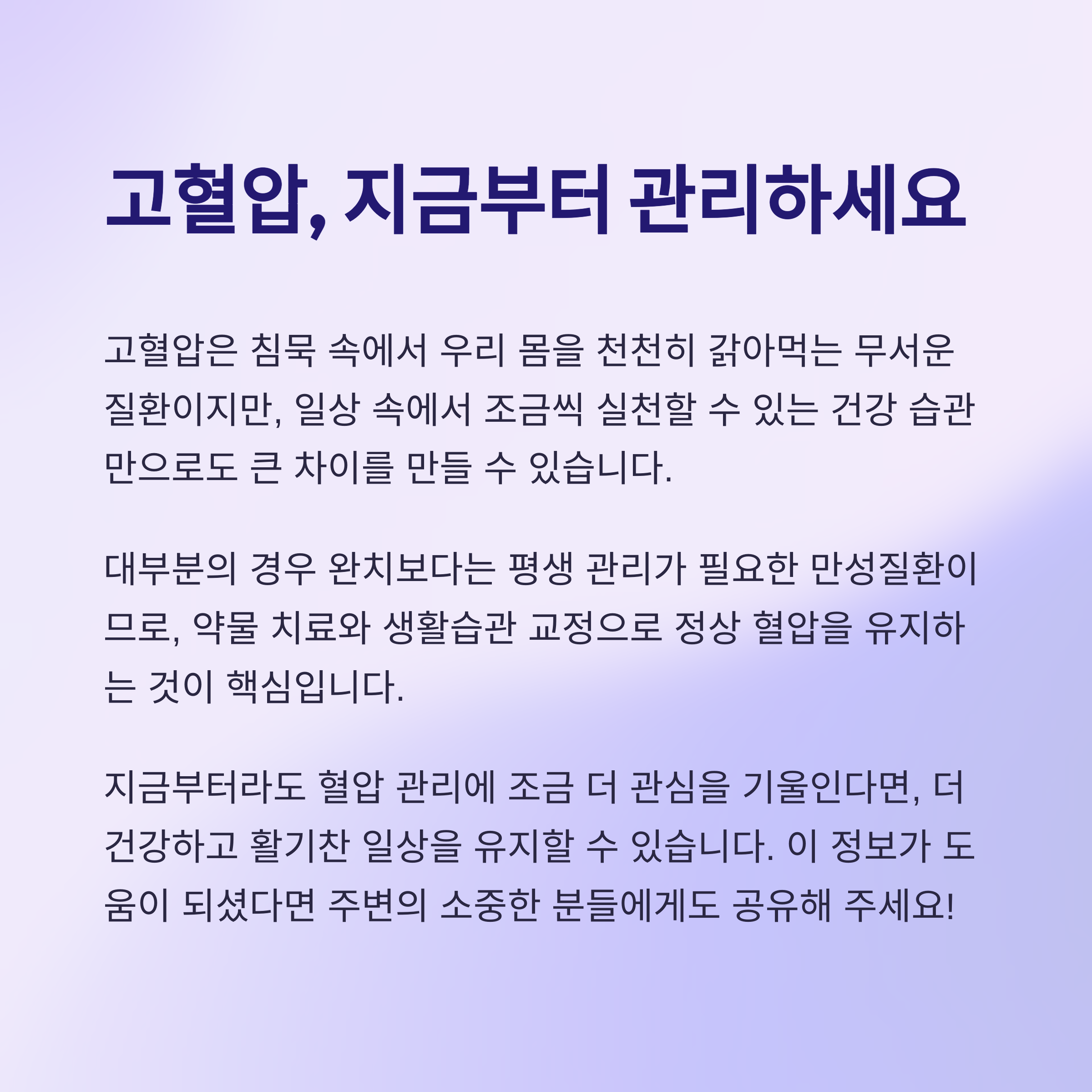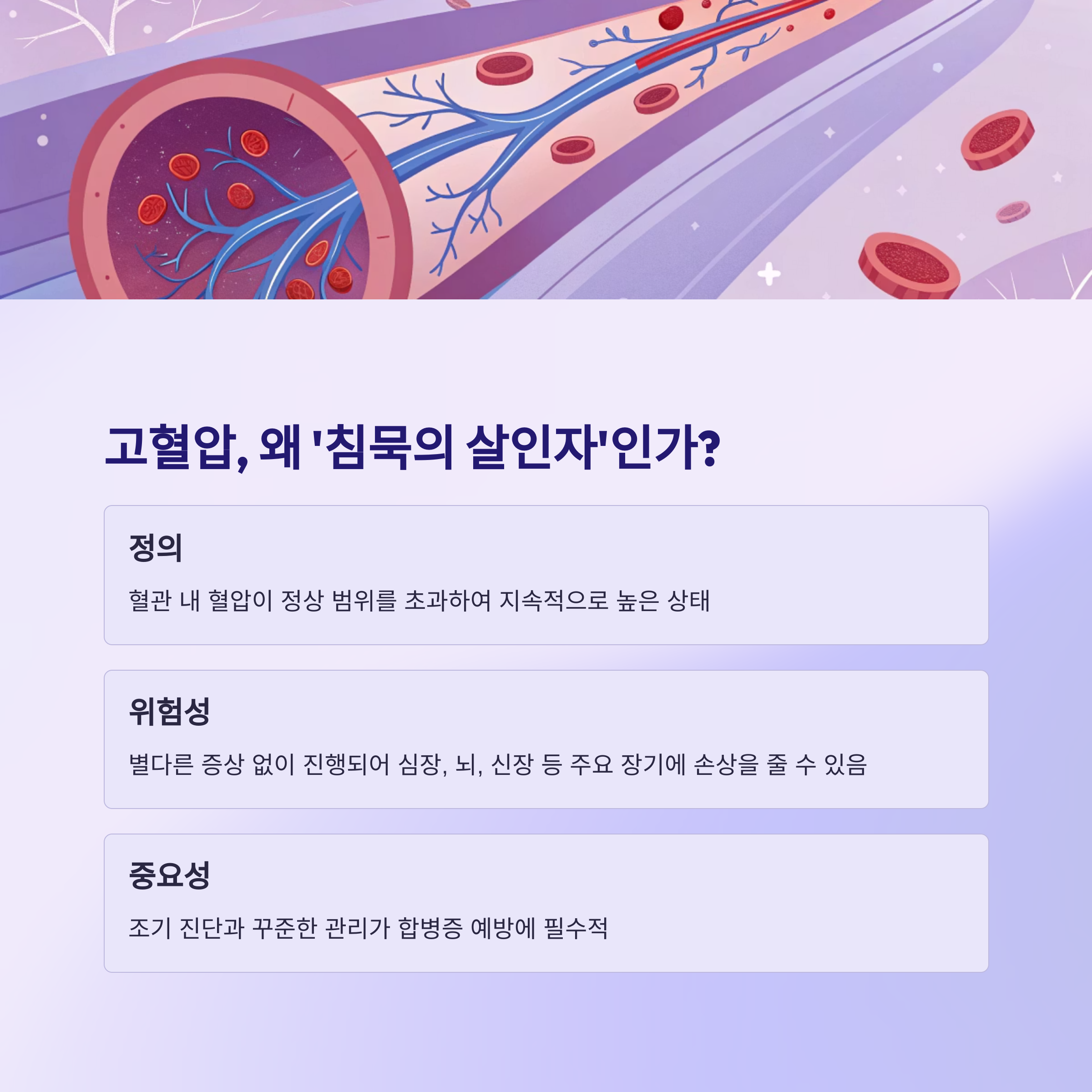 고혈압은 뚜렷한 증상이 없어 방치되기 쉬운 질환입니다. 조기에 알고 관리하는 것이 무엇보다 중요합니다.
