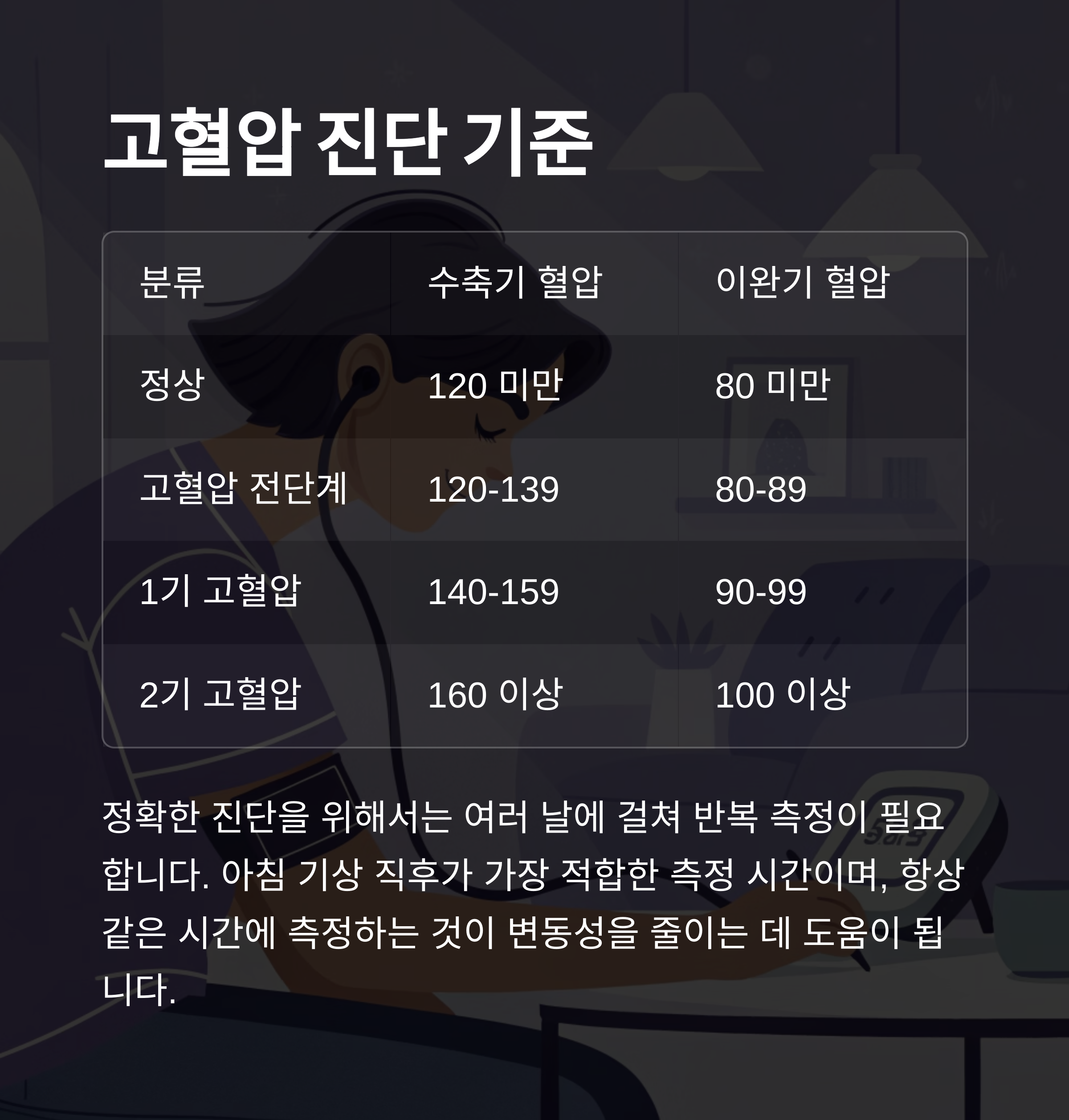 진단은 여러 번의 혈압 측정 결과를 기준으로 내려지며, 의사의 판단이 포함됩니다.