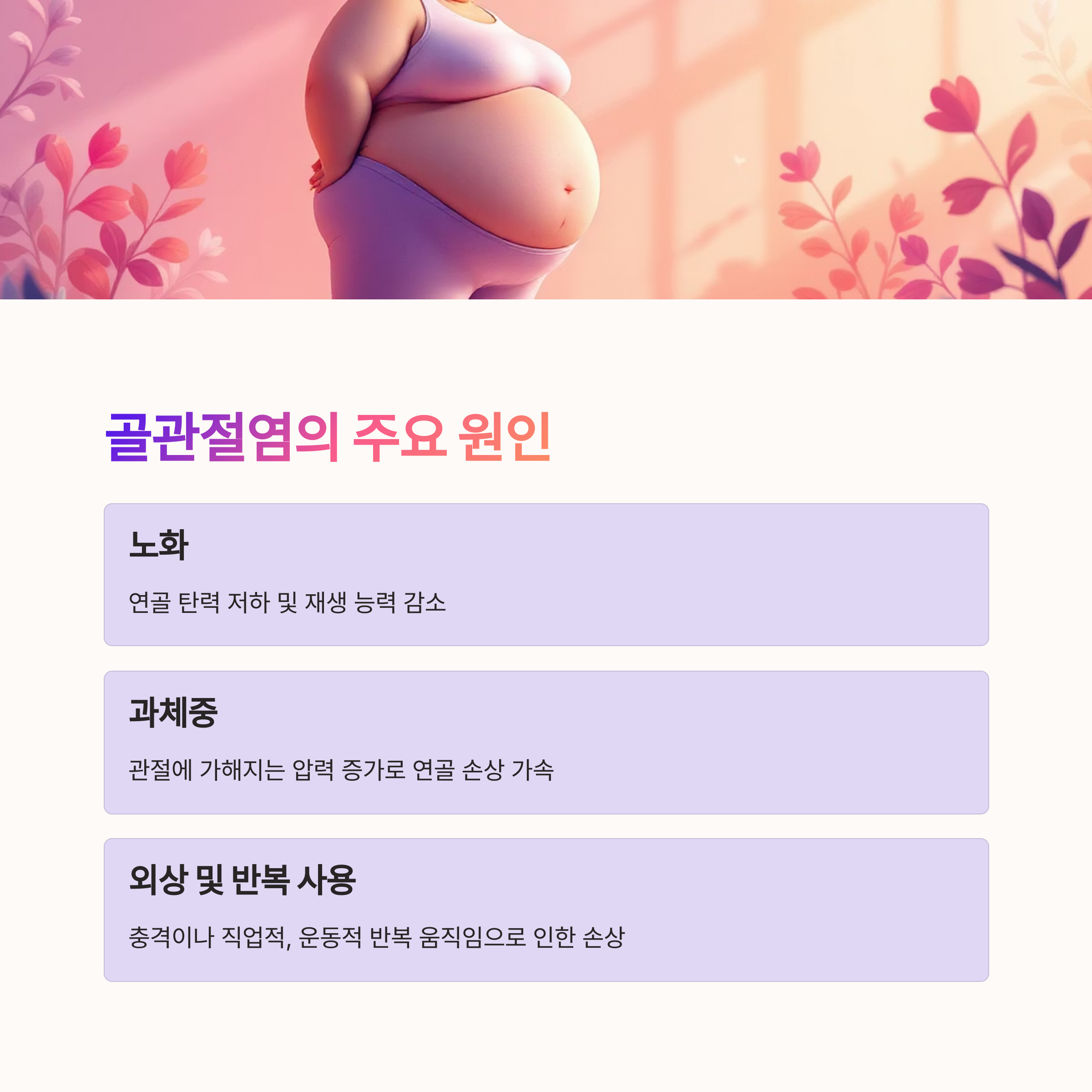 최근에는 과체중, 운동 과다, 외상 등으로 인해 젊은 층에서도 발병률이 증가하고 있습니다.