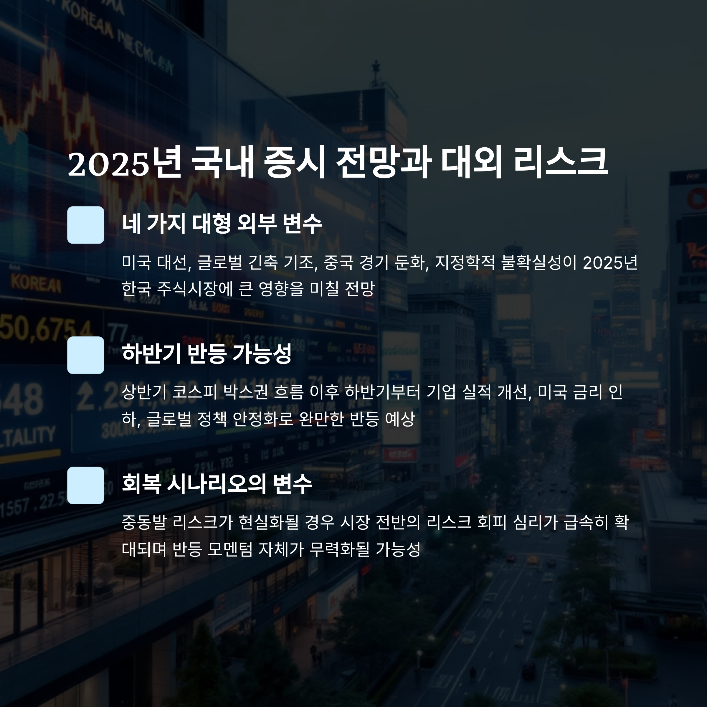 2025년 한국 주식시장은 미국 대선, 글로벌 긴축 기조, 중국 경기 둔화, 그리고 지정학적 불확실성이라는 네 가지 대형 외부 변수에 크게 영향을 받을 전망입니다.