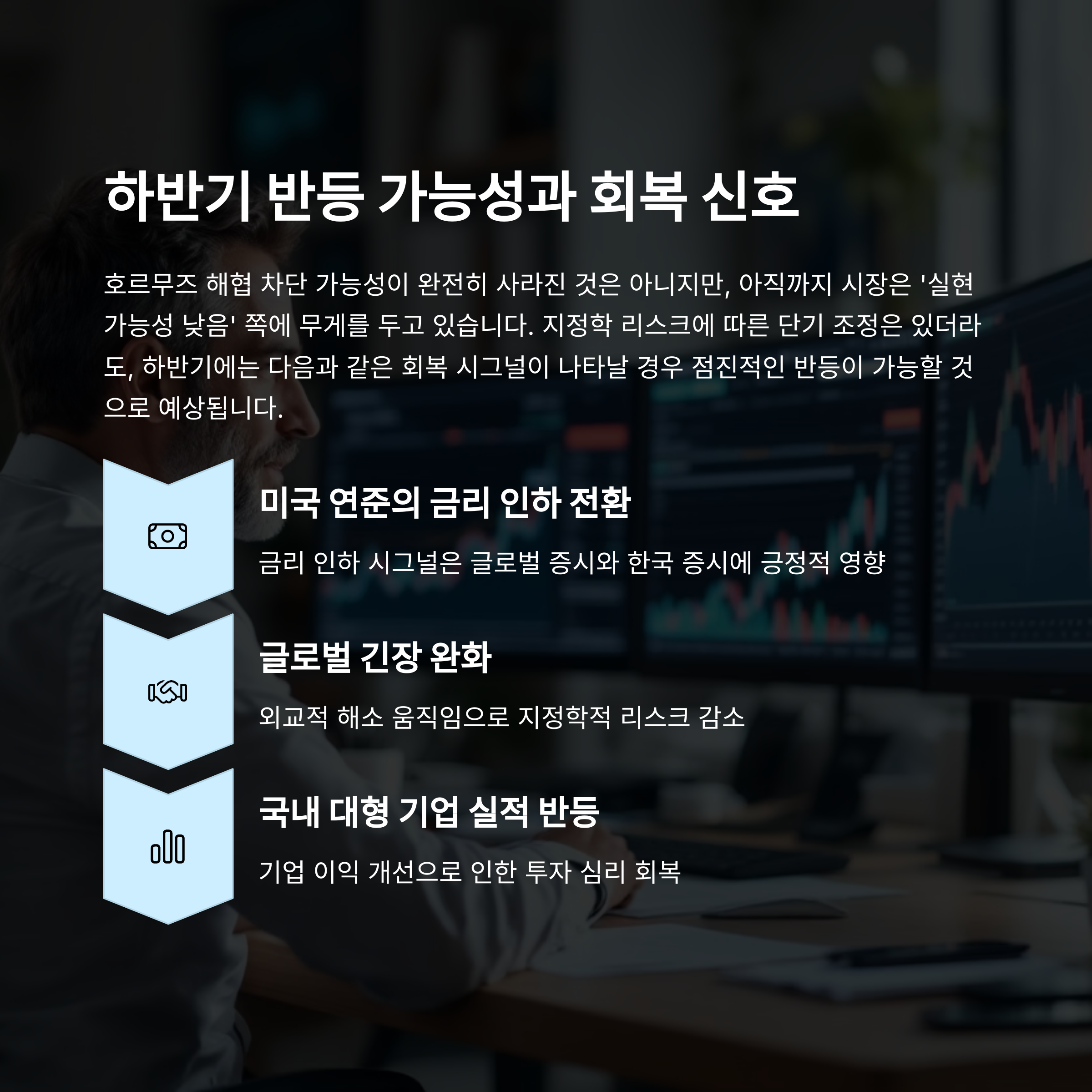 따라서 지정학 리스크에 따른 단기 조정은 있더라도, 하반기에는 다음과 같은 회복 시그널이 나타날 경우 점진적인 반등이 가능할 것으로 예상됩니다.