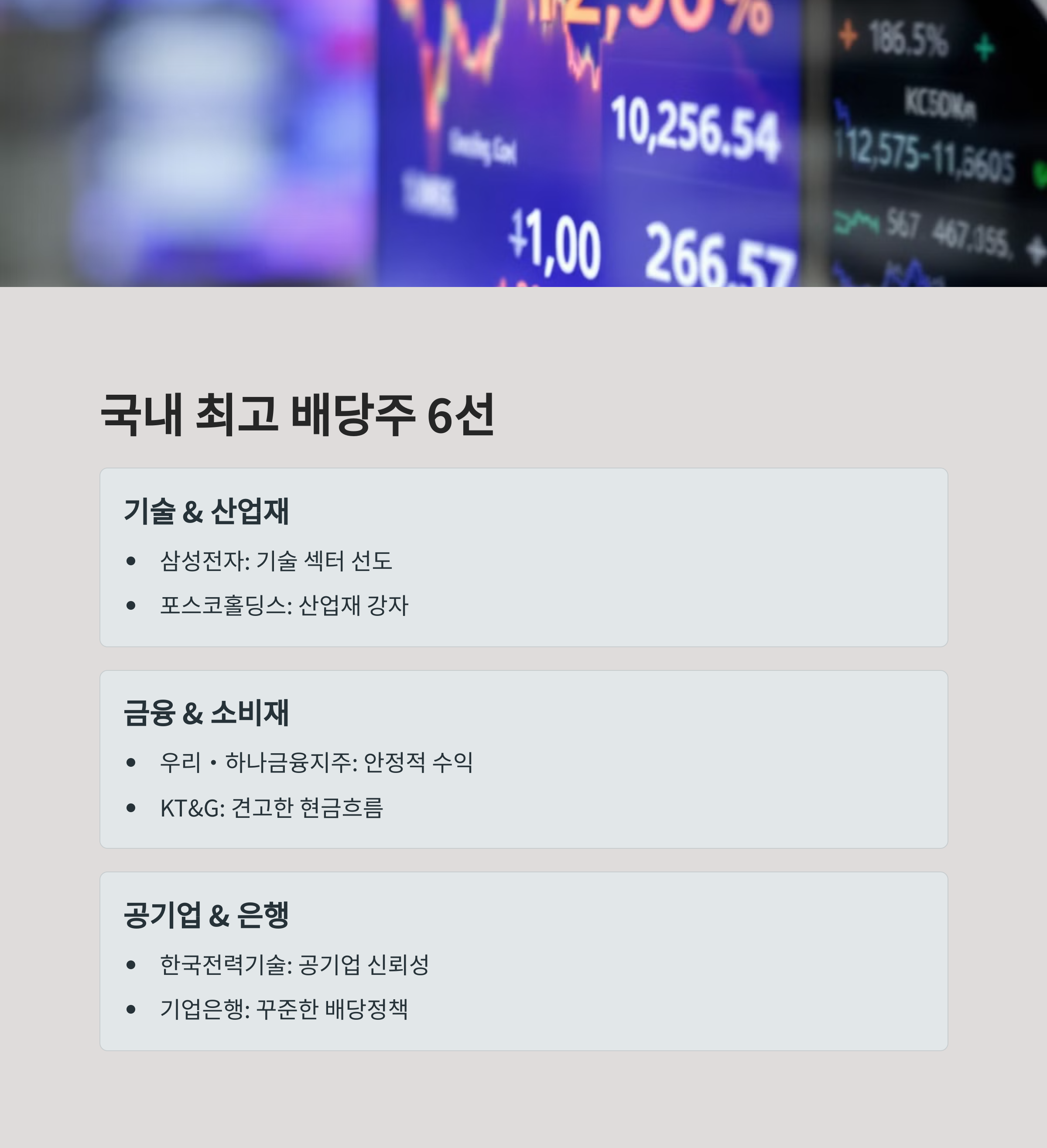 지금 소개할 국내 배당주 TOP 7은 배당 성향과 실적의 안정성을 고려해 선정된 종목입니다. 대표적으로 삼성전자는 꾸준한 배당 지급은 물론, 성장성과 안정성을 겸비한 대표적인 배당주입니다. KT&G는 꾸준한 현금흐름과 자사주 소각 등 주주 친화 정책으로 인기 있는 종목이며, 한국전력기술, 기업은행, 포스코홀딩스 등도 안정적인 배당을 지속하고 있습니다. 또한 우리금융지주, 하나금융지주는 금융업 특유의 고배당 성향으로 많은 투자자들에게 장기 보유 종목으로 선택되고 있습니다.