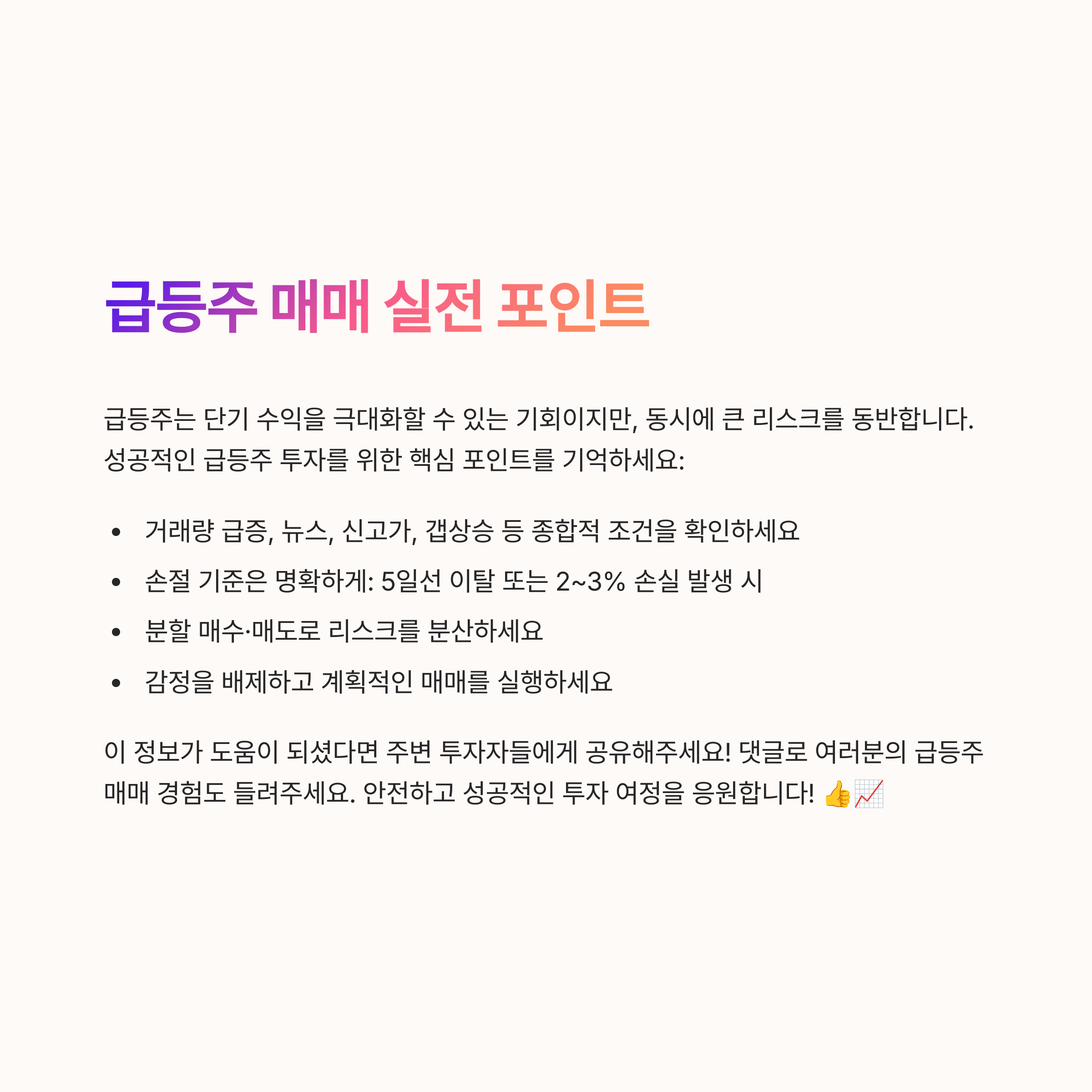 급등주는 단기 수익을 극대화할 수 있는 기회이지만, 동시에 매우 큰 리스크를 동반하는 전략입니다.