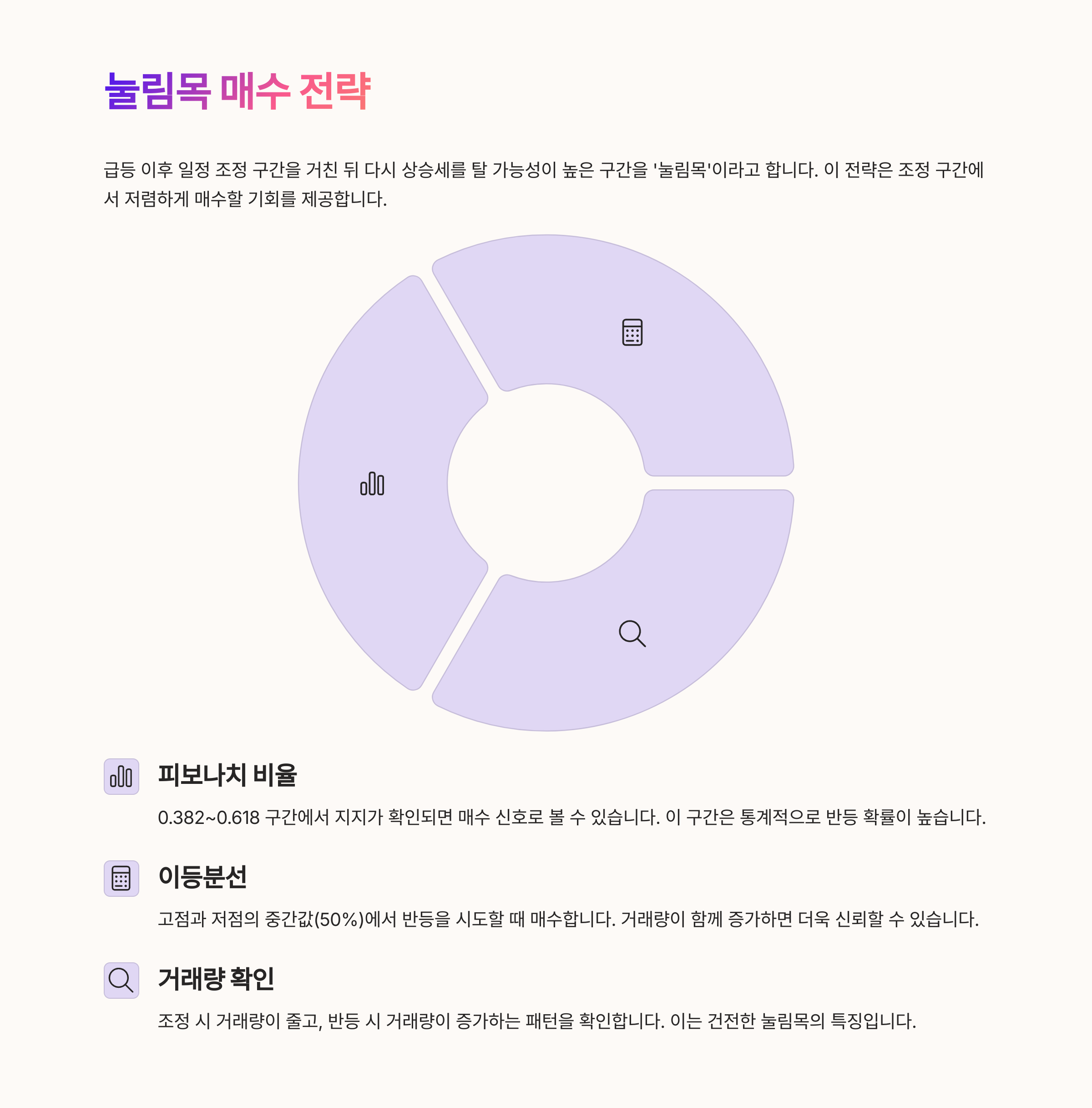 특히 이등분선(50%)과 피보나치 0.382~0.618 구간은 통계적으로 재상승 확률이 높다고 알려져 있습니다.