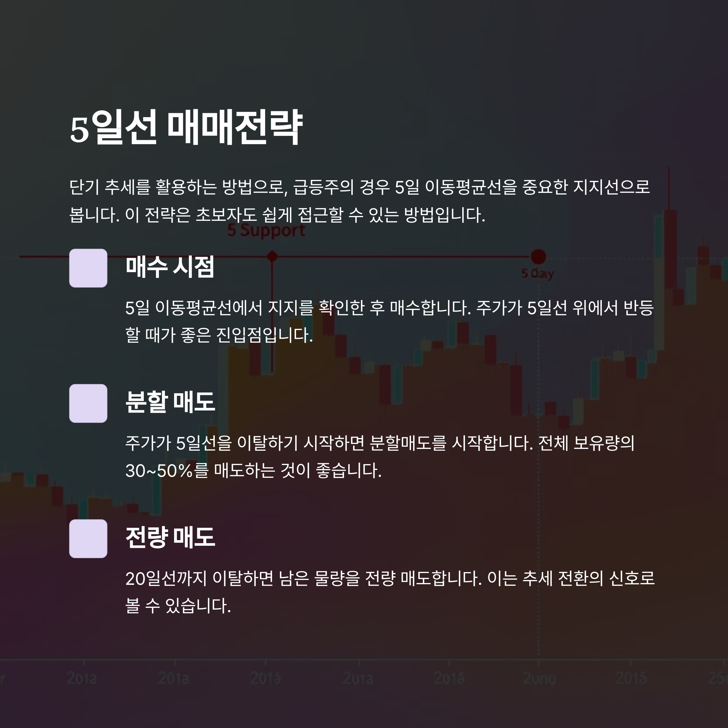 - 손절 기준은 명확하게: 5일선 이탈, 2~3% 손실 발생 시