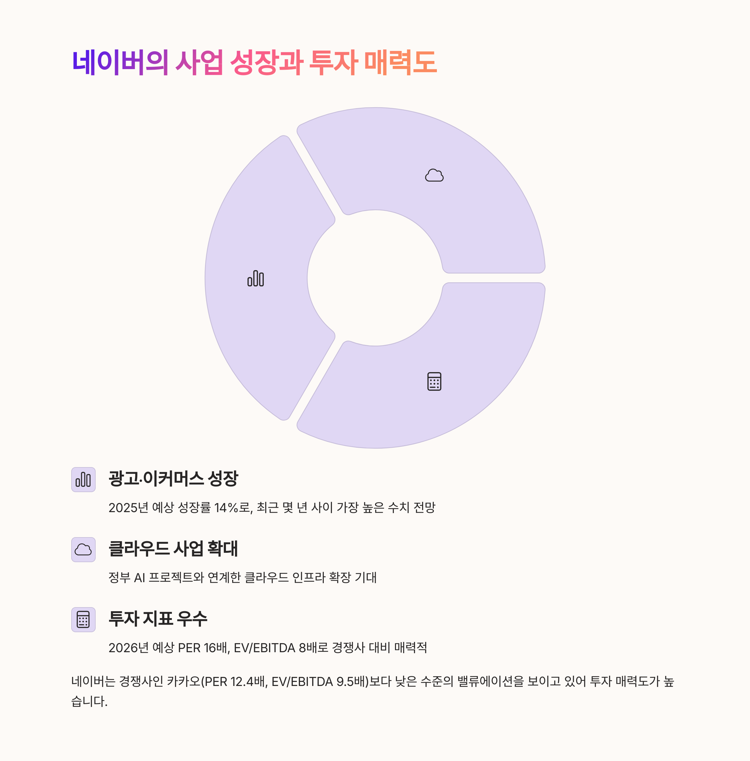 네이버는 AI뿐 아니라 클라우드, 광고, 이커머스 부문에서도 지속적인 성장을 이어가고 있습니다.