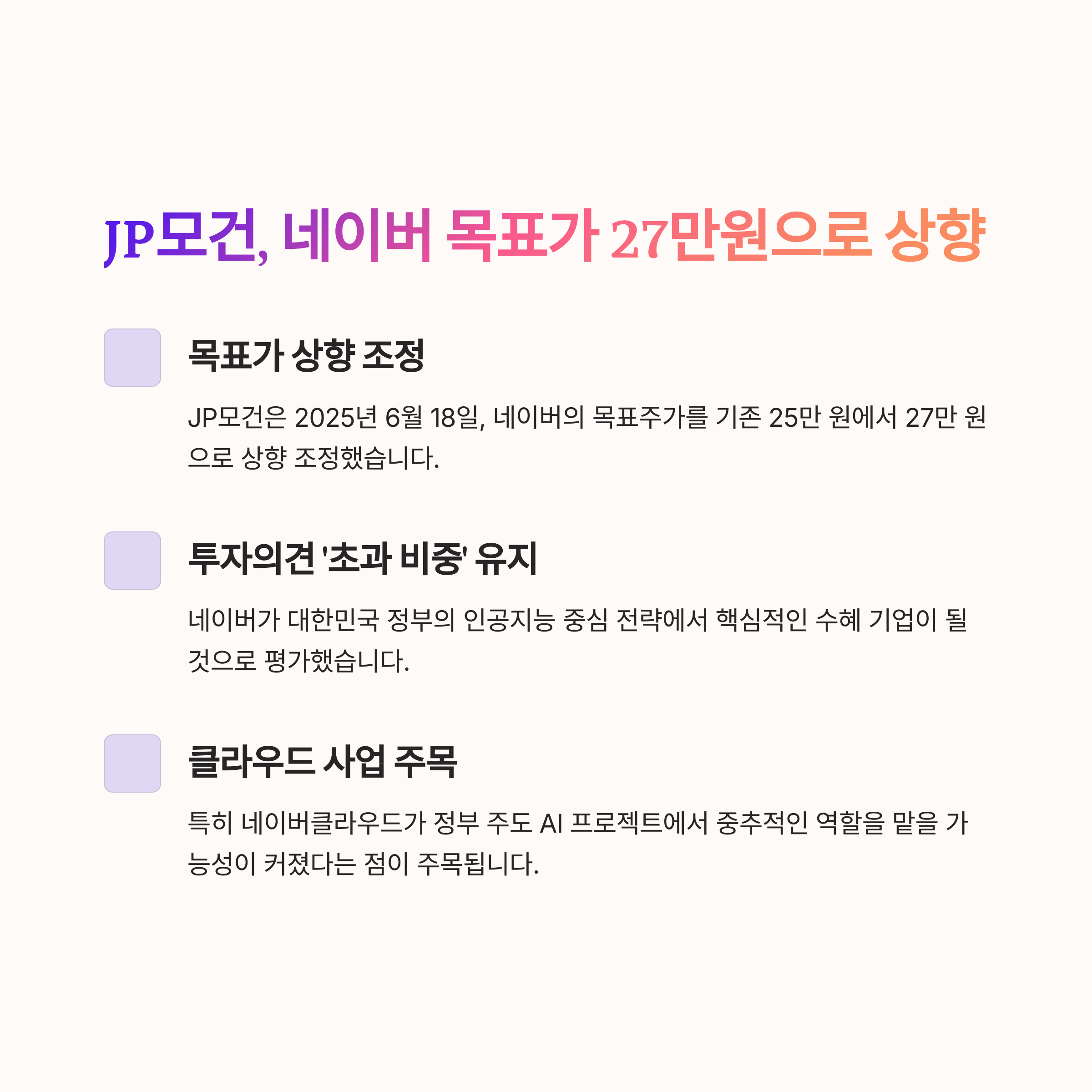 2025년 6월 18일, 글로벌 투자은행 JP모건은 네이버의 목표주가를 기존 25만 원에서 27만 원으로 상향 조정했습니다.