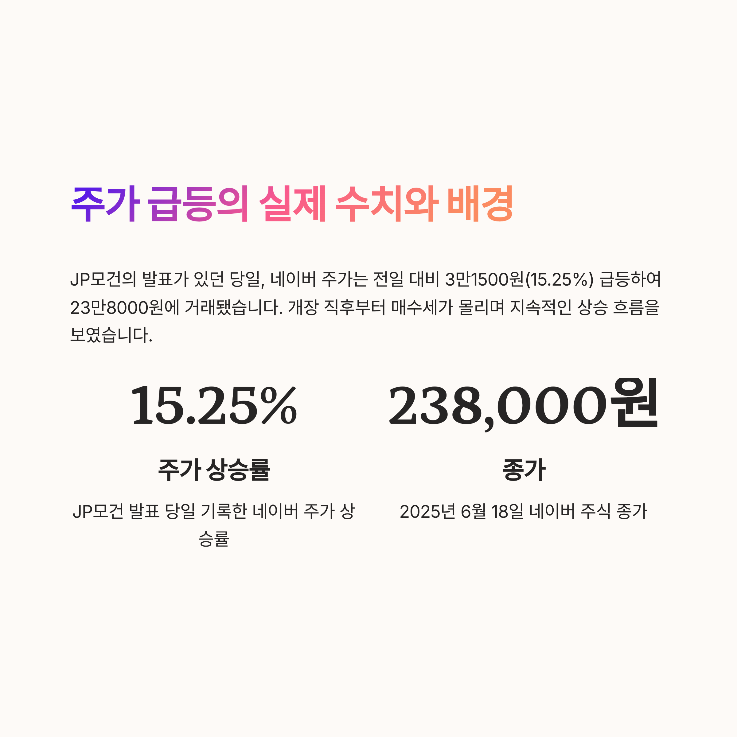 JP모건의 발표가 있던 당일, 네이버 주가는 전일 대비 3만1500원(15.25%) 급등하여 23만8000원에 거래됐습니다.