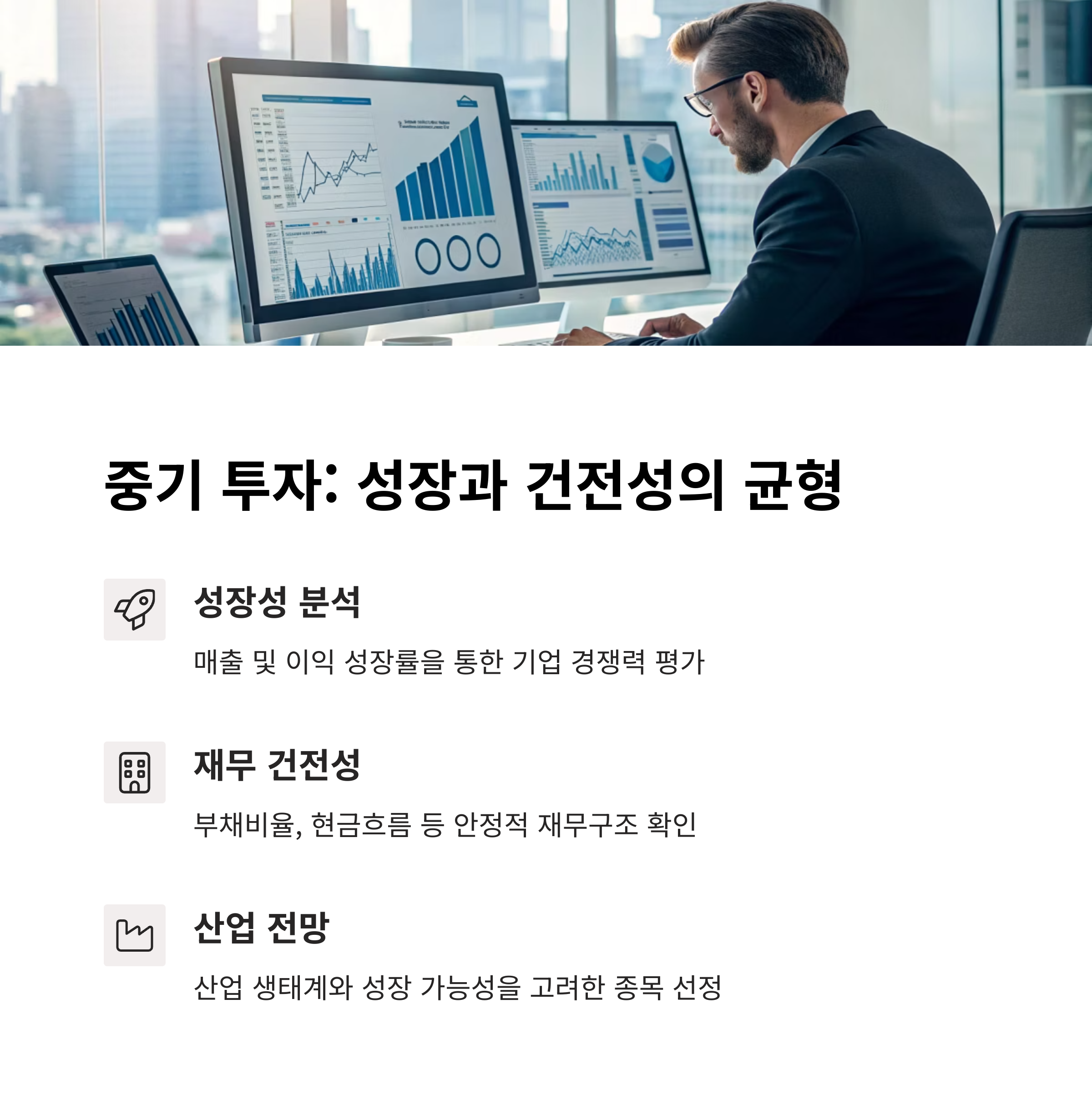 중기 투자의 전략은 '성장성'과 '재무 안정성'의 균형입니다. 대개 3~6개월 혹은 1년 이내의 기간을 설정하며, 이익 모멘텀이 살아있는 기업을 중심으로 포트폴리오를 구성해야 합니다.