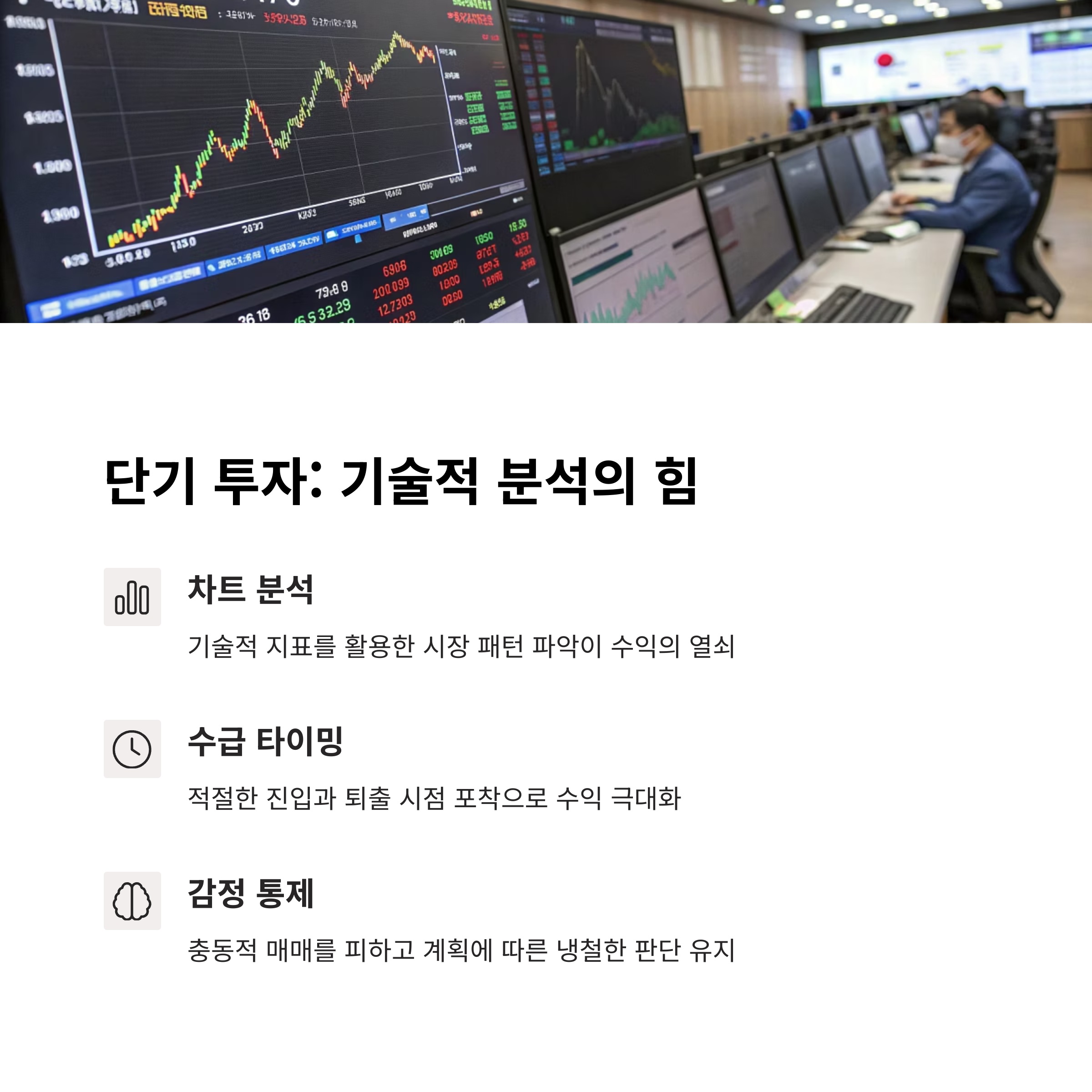 네. 단기 투자는 ‘정보’보다 ‘타이밍’이 더 중요하므로 기술적 분석 없이는 진입과 이탈 시점을 잡기 어렵습니다.