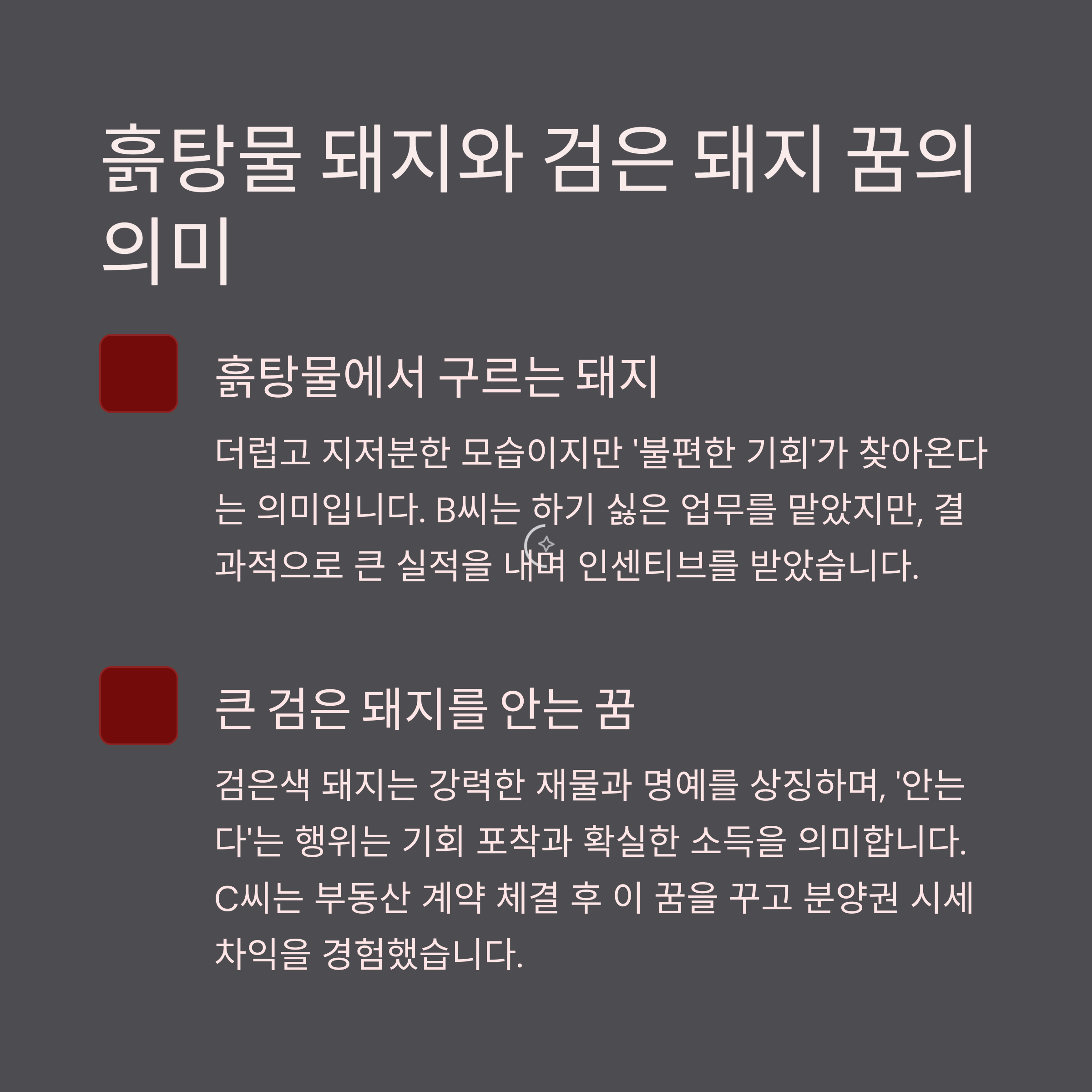 더럽고 지저분한 돼지의 모습은 얼핏 불쾌할 수 있지만, 이 꿈은 오히려 ‘불편한 기회’가 찾아온다는 의미로 해석됩니다.