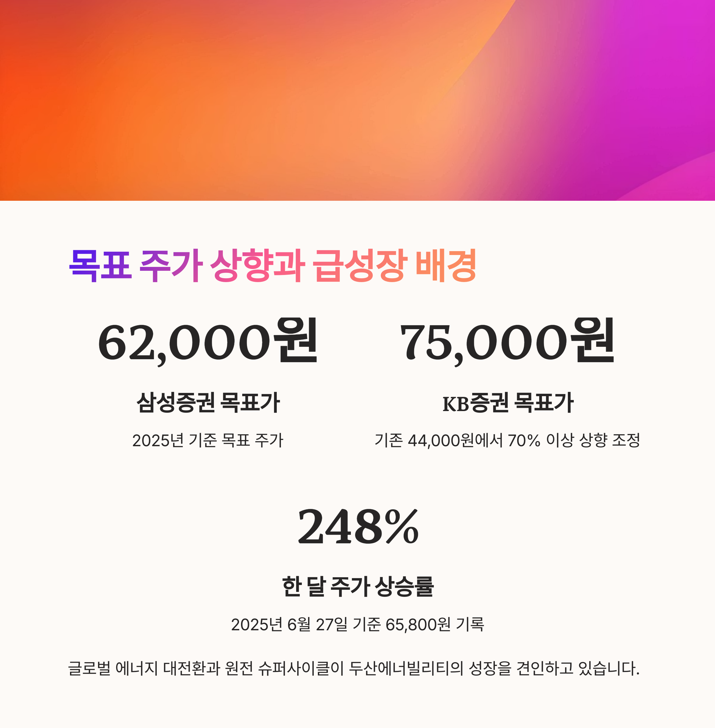2025년 6월 27일 기준 두산에너빌리티의 실제 주가는 65,800원으로, 불과 한 달 만에 약 248% 상승한 기록적인 흐름을 보여주고 있습니다.