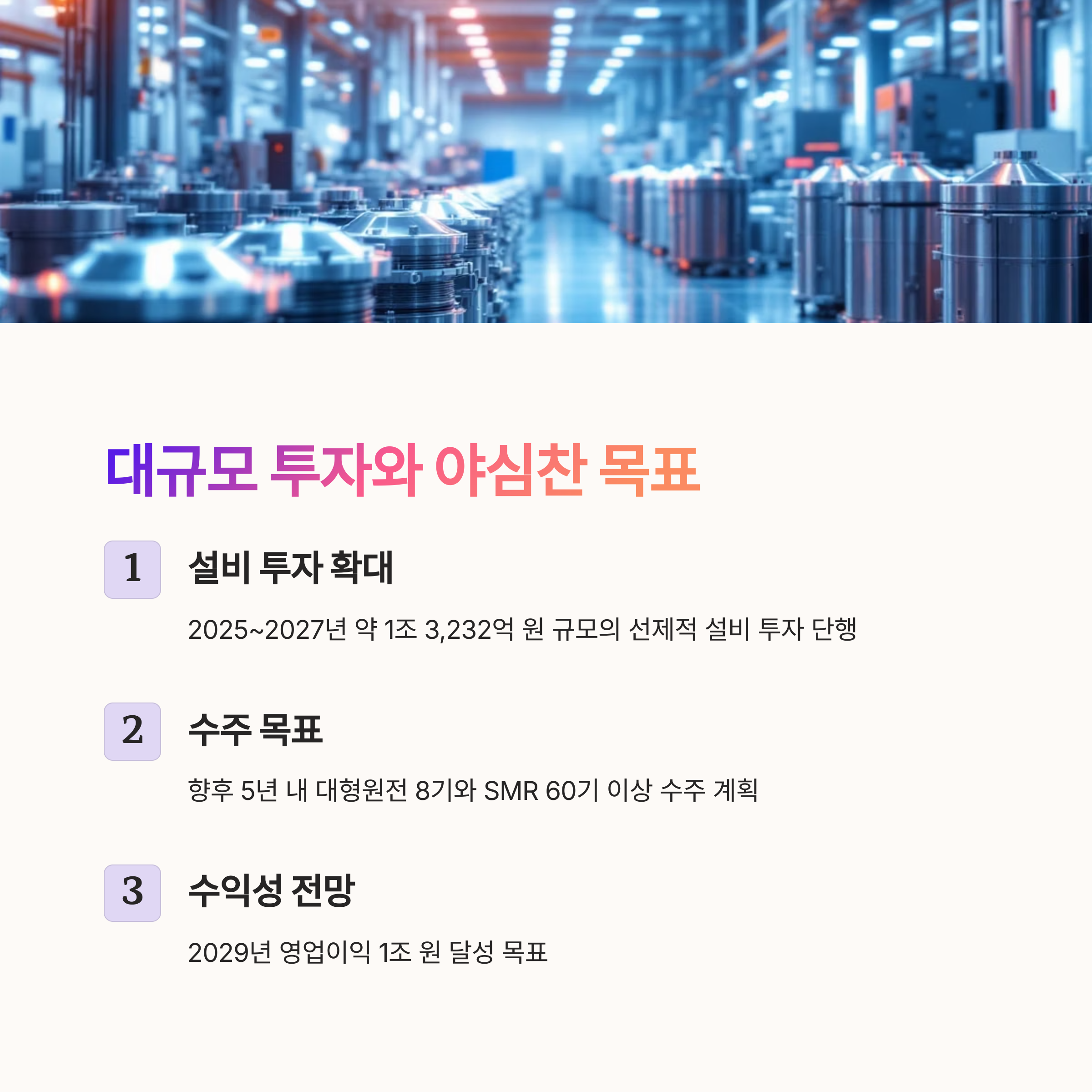 원전 슈퍼사이클이라 불리는 이 흐름 속에서 두산은 2025년부터 약 3년간 총 1조 3,232억 원 규모의 설비 투자를 단행하며 선제적 대응에 나섰습니다.