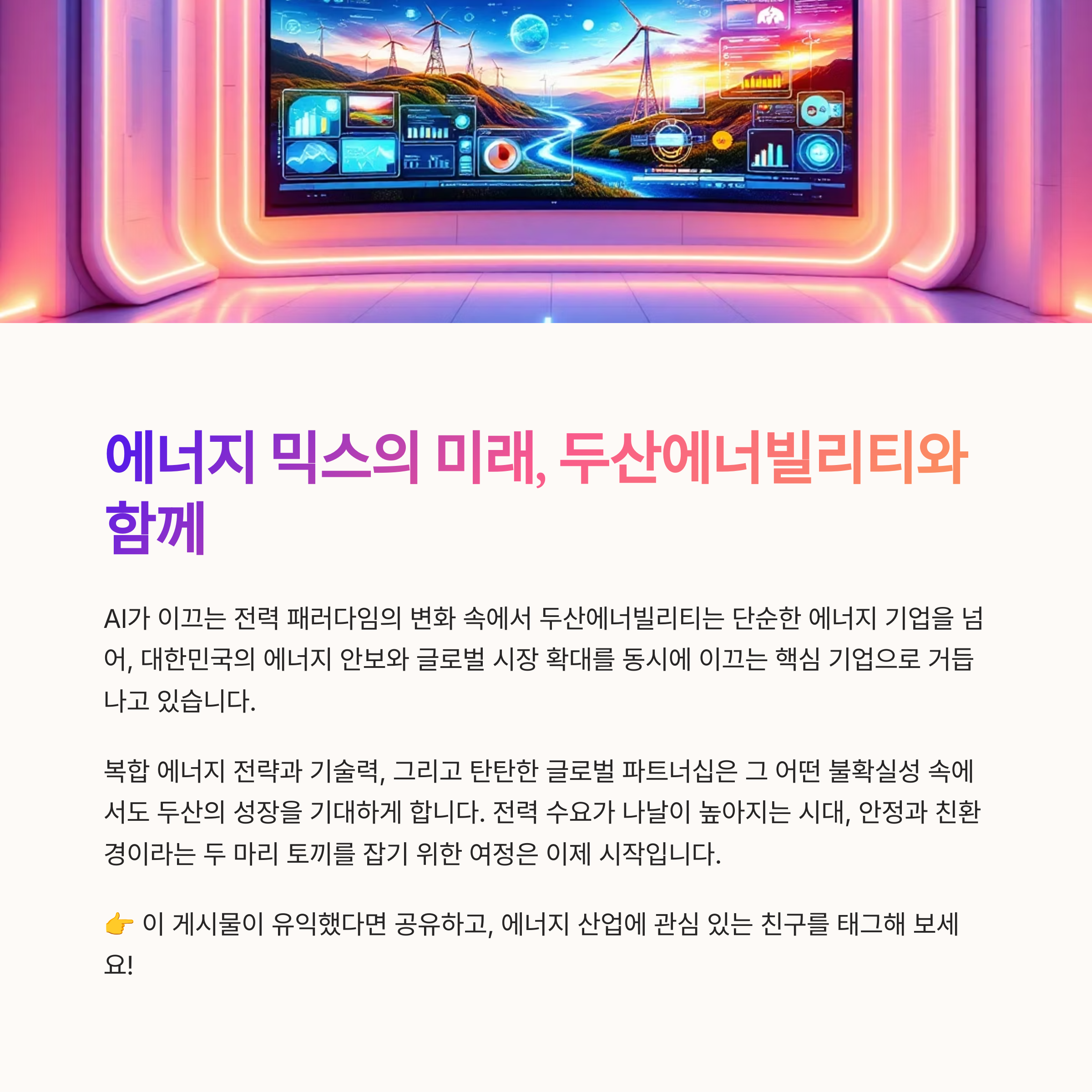 AI가 이끄는 전력 패러다임의 변화 속에서 두산에너빌리티는 단순한 에너지 기업을 넘어, 대한민국의 에너지 안보와 글로벌 시장 확대를 동시에 이끄는 핵심 기업으로 거듭나고 있습니다.