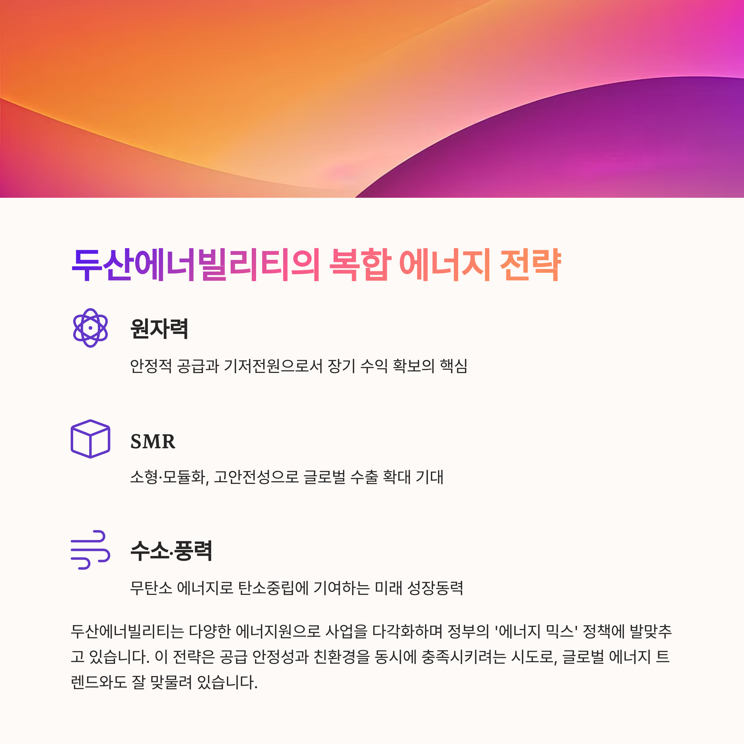 각 에너지원은 특정한 역할과 전략적 가치를 가지고 있으며, 두산은 이를 종합해 에너지 믹스를 실현하고 있습니다.