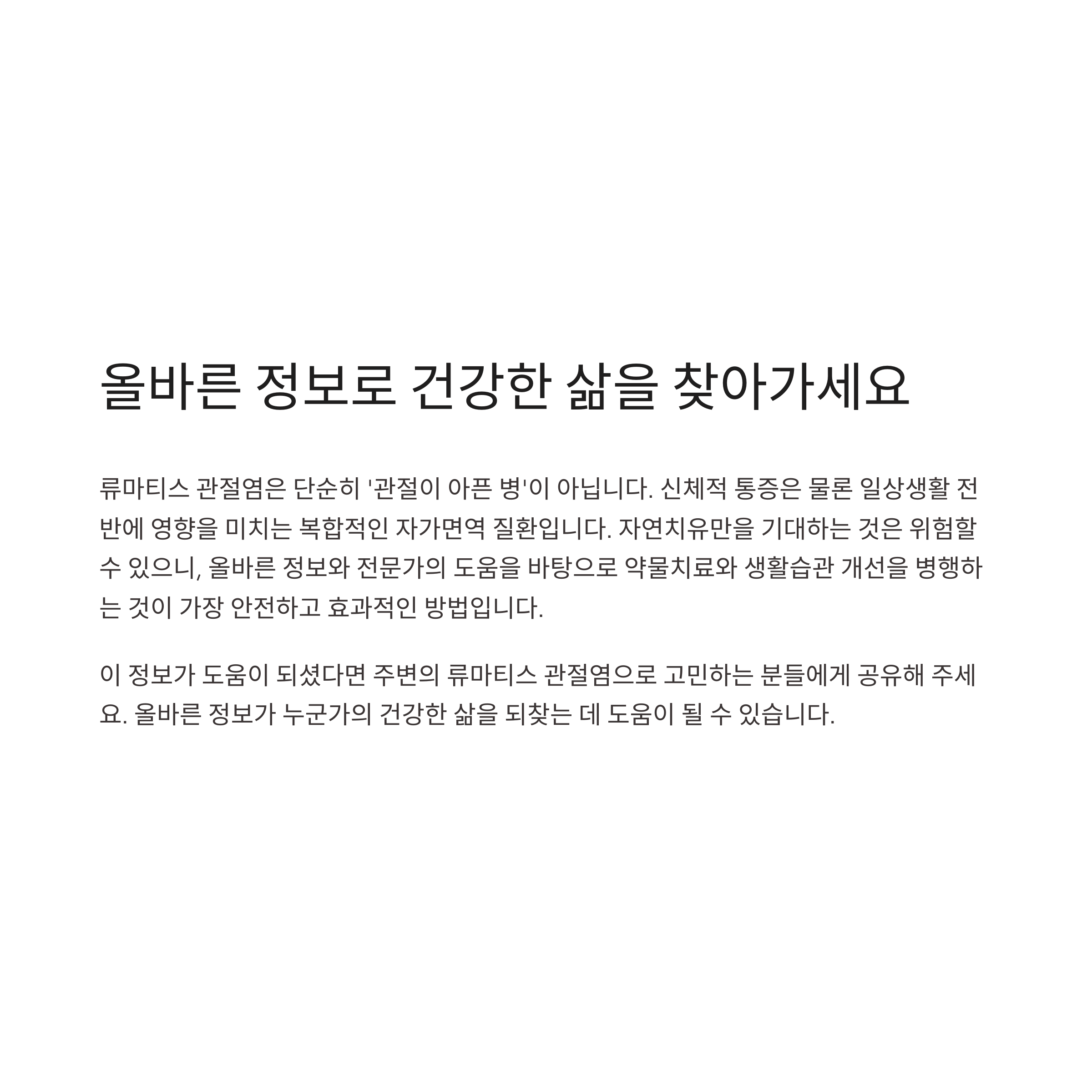 - 초기 증상 인지 시 즉시 류마티스 전문의 상담