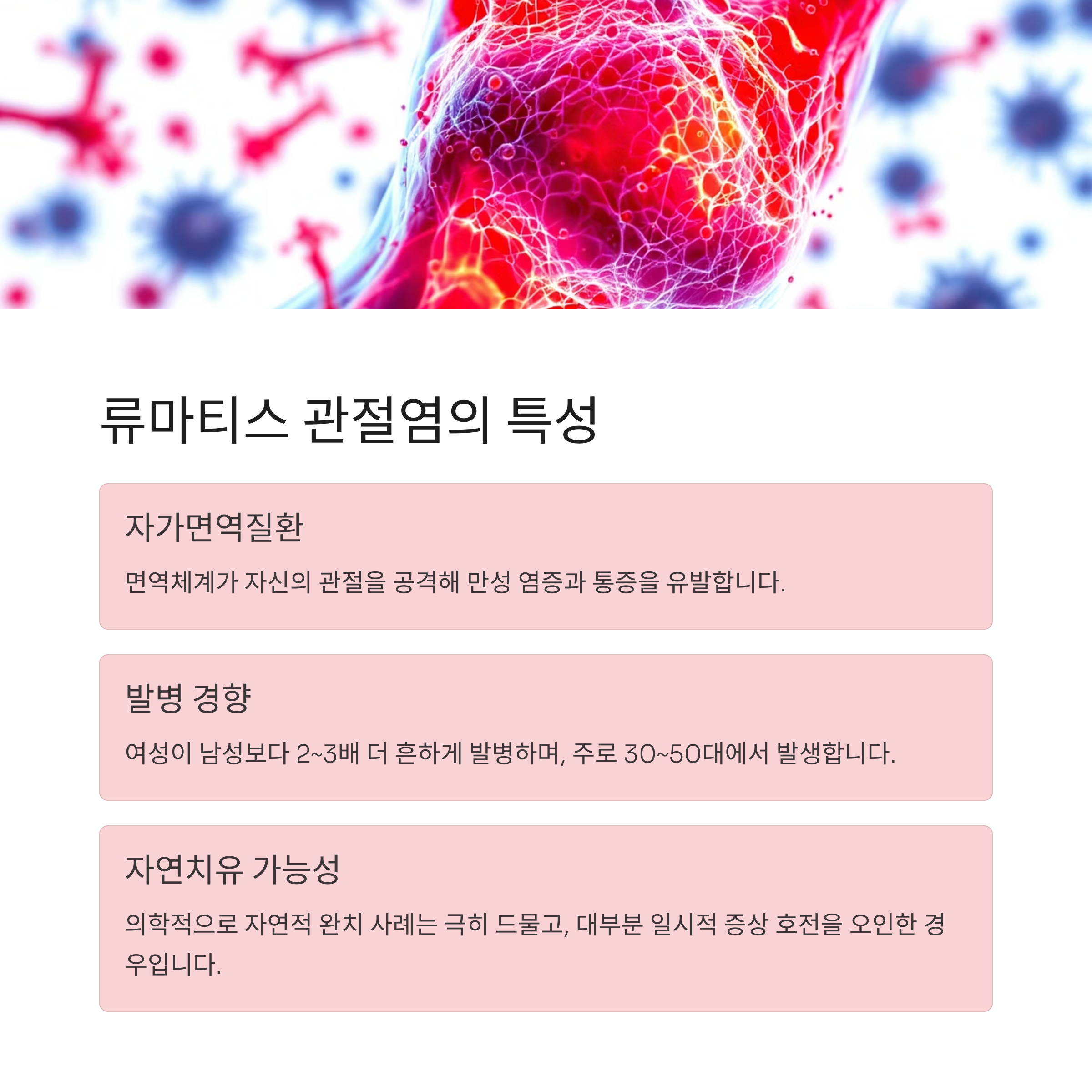 류마티스 관절염은 자가면역질환의 일종으로, 면역체계가 자신의 관절을 공격해 만성 염증과 통증을 유발합니다.