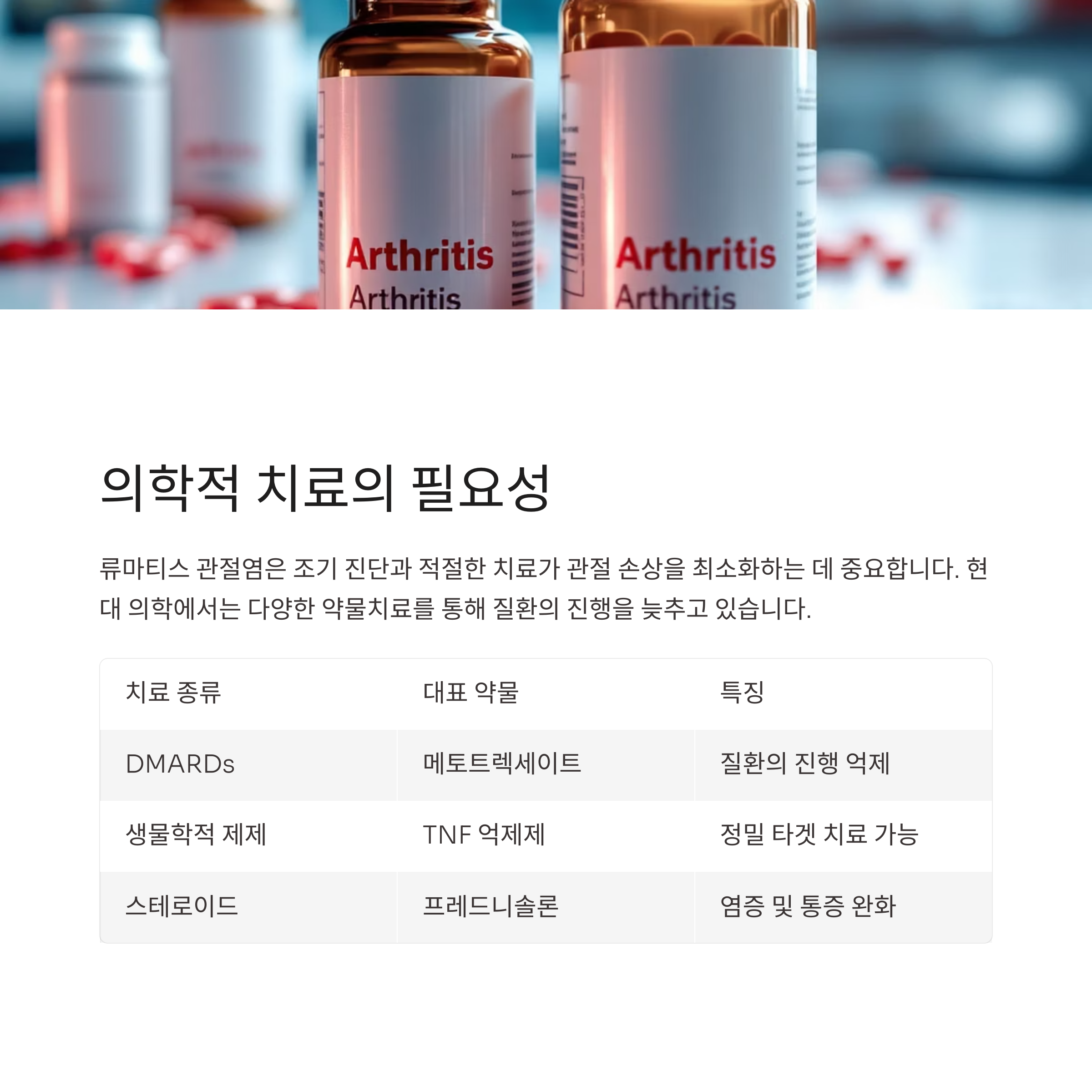 현대 의학에서는 류마티스 관절염의 진행을 늦추고 관절 손상을 최소화하기 위해 다양한 약물치료를 시행하고 있습니다.