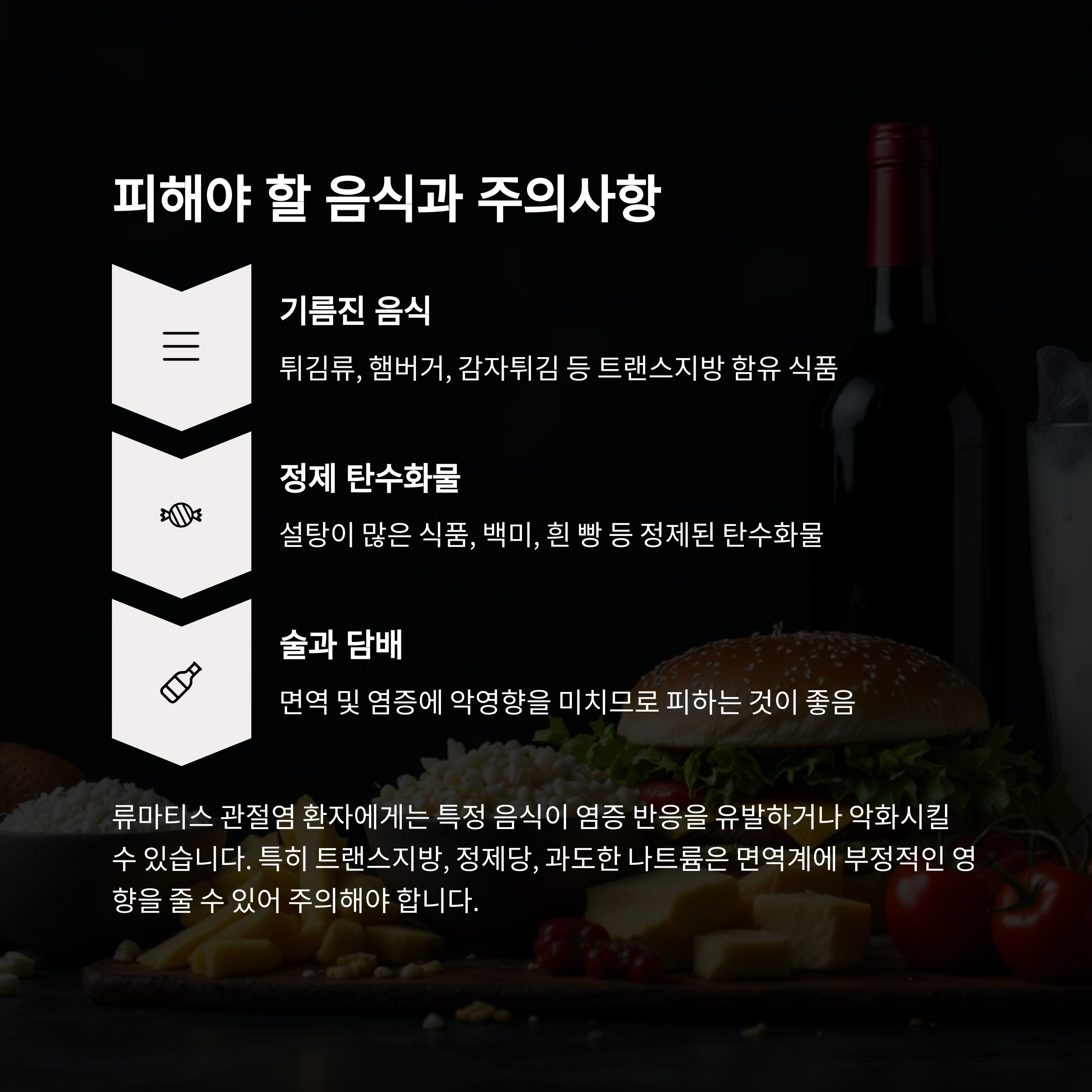 류마티스 관절염 환자에게는 특정 음식이 염증 반응을 유발하거나 악화시킬 수 있습니다.