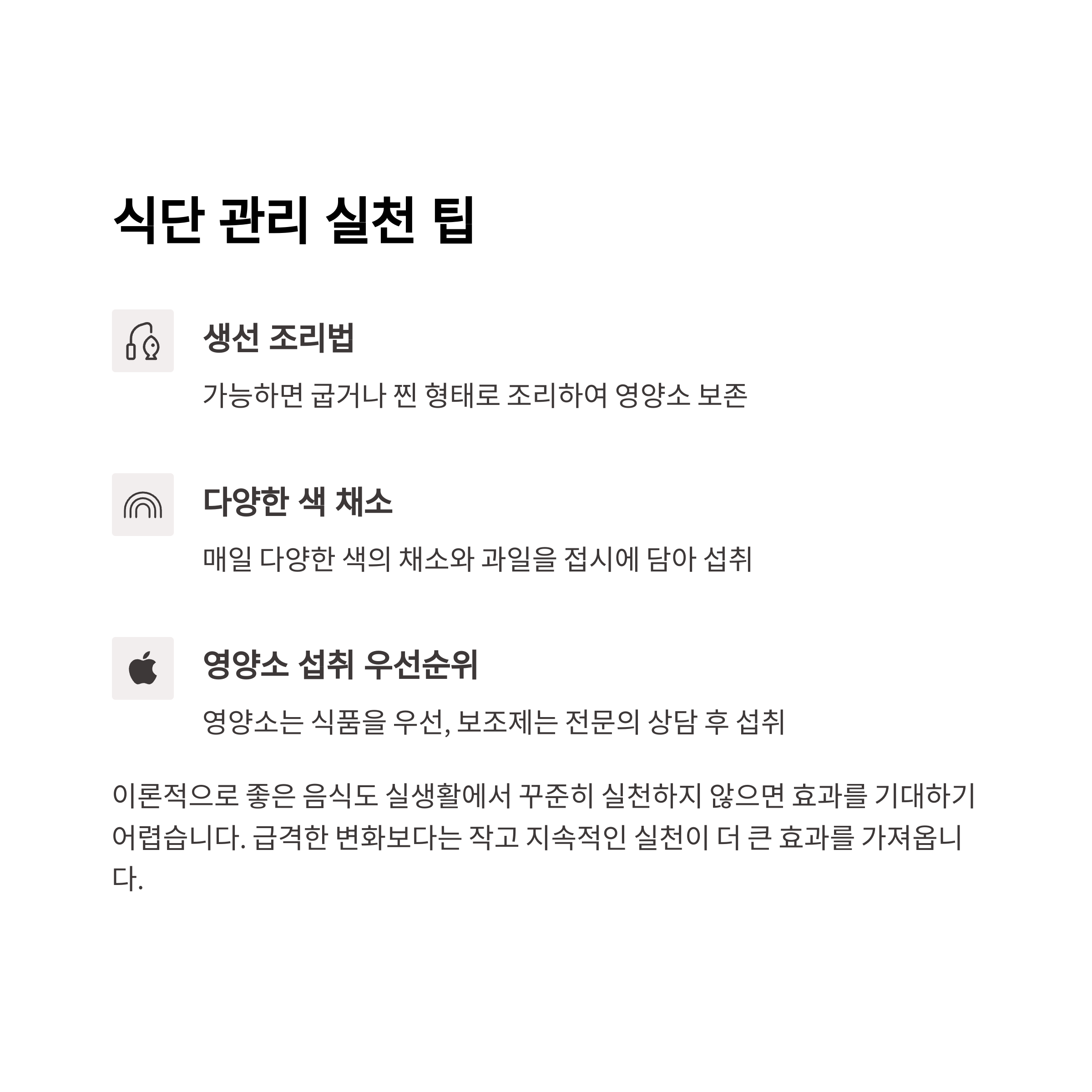 - 영양소 섭취는 식품을 우선, 보조제는 전문의 상담 후