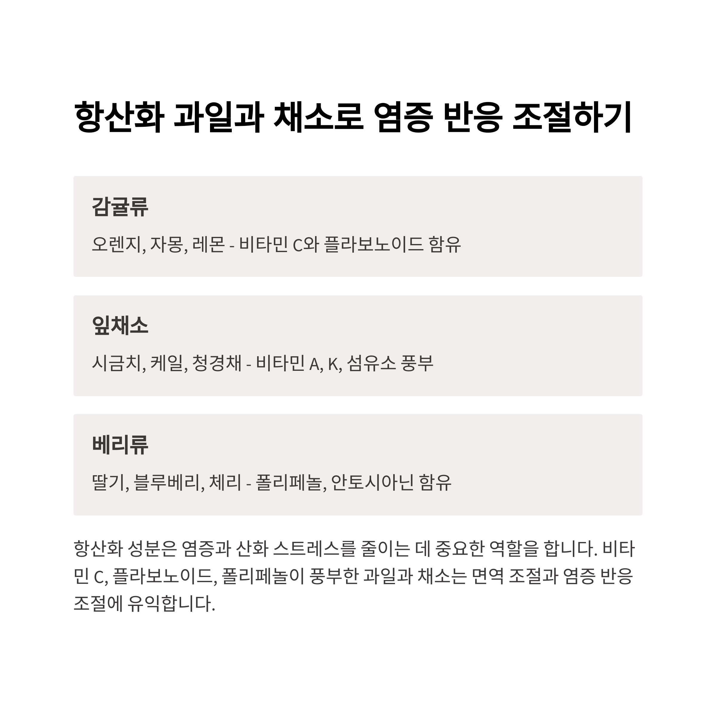 특히 비타민 C와 플라보노이드, 폴리페놀 같은 성분이 풍부한 과일과 채소는 면역 조절과 염증 반응 조절에 유익한 것으로 나타났습니다.