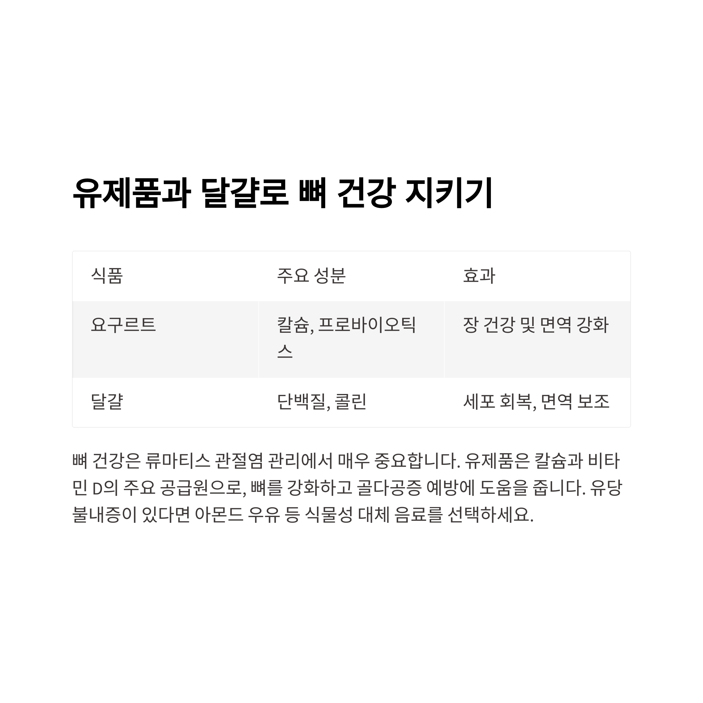 유제품은 칼슘과 비타민 D가 풍부하여 뼈 건강에 긍정적인 영향을 줍니다.