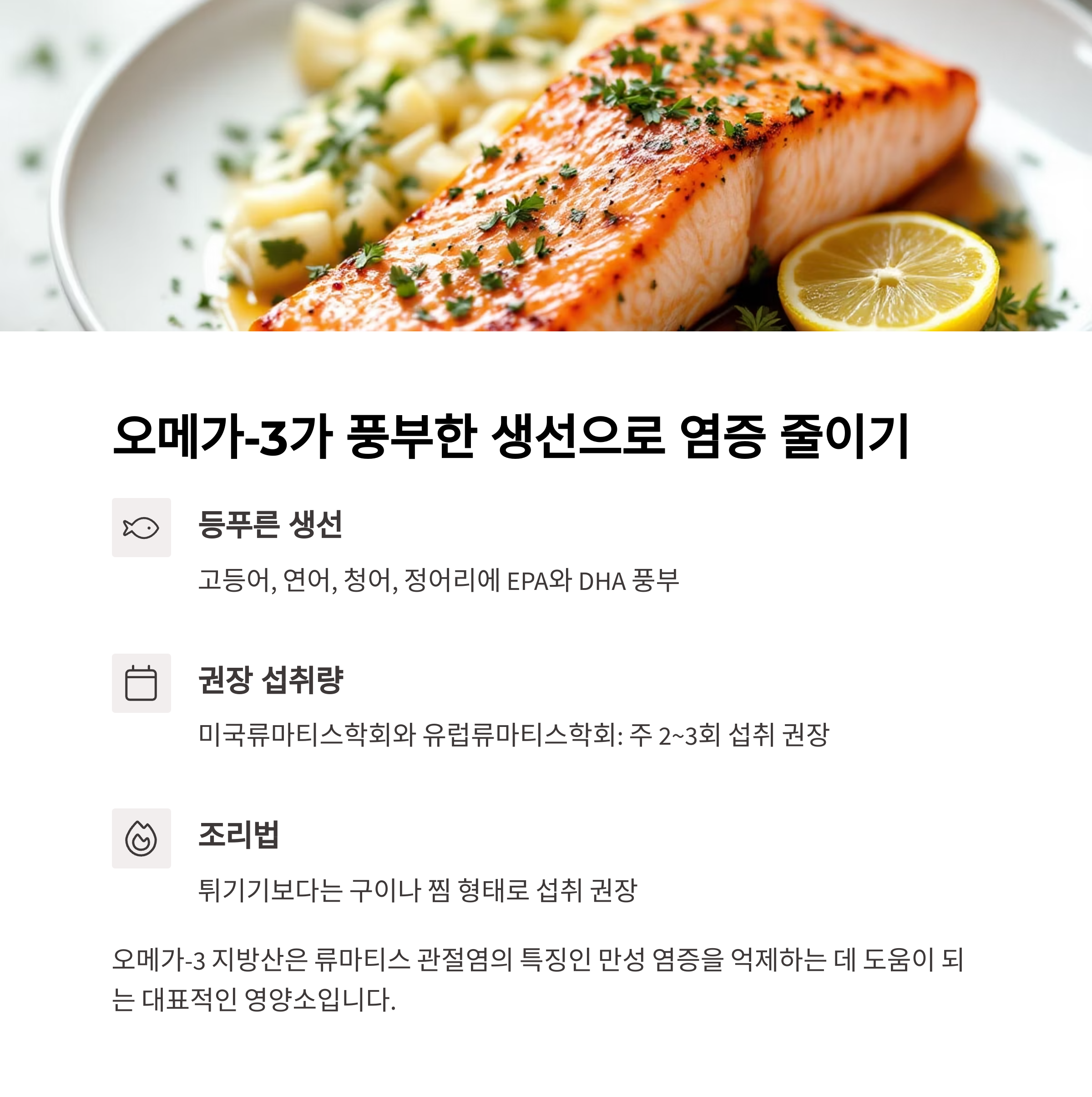 미국류마티스학회(ACR)와 유럽류마티스학회(EULAR)는 오메가-3가 포함된 생선 섭취를 일주일에 2~3회 권장하고 있습니다.