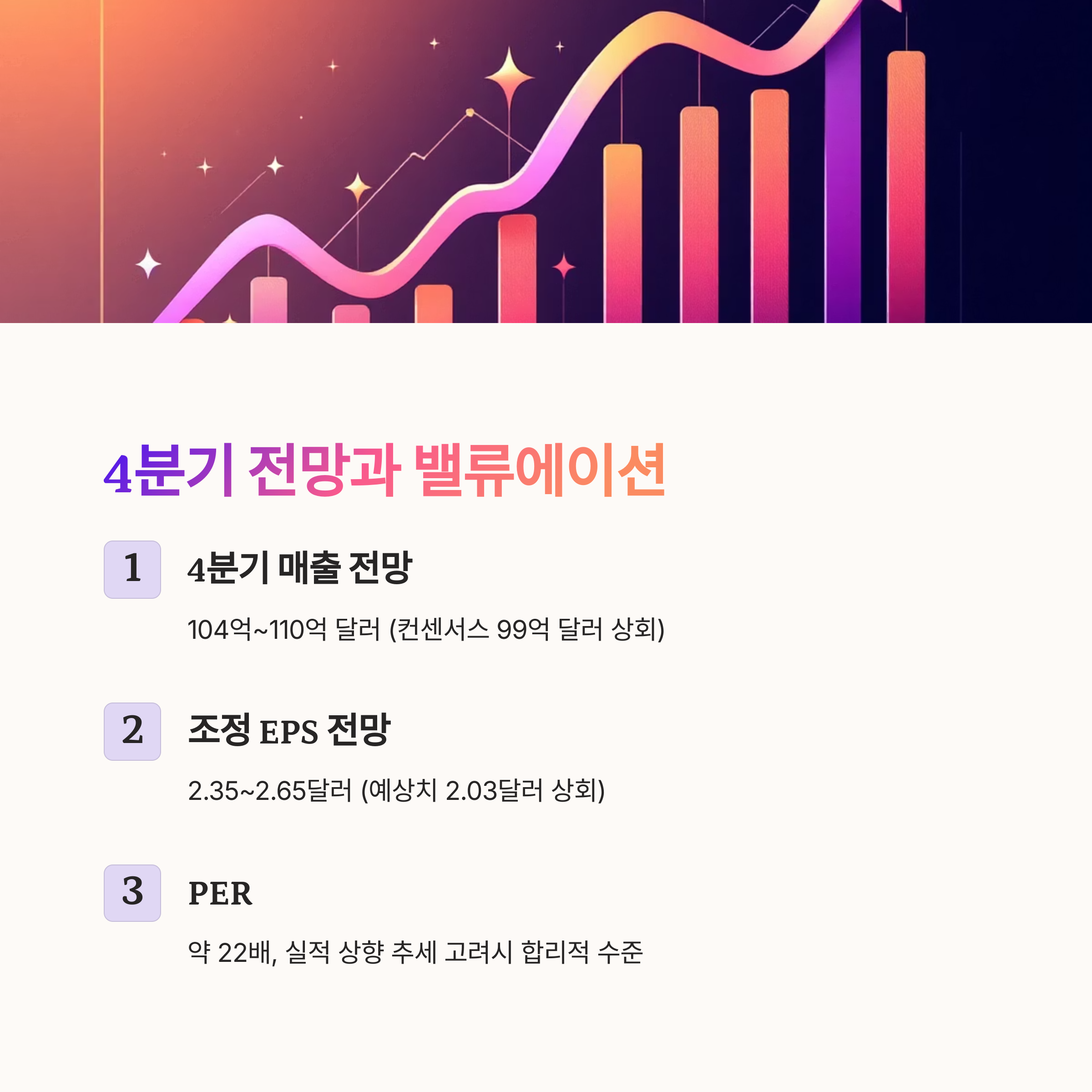 매출 전망은 104억~110억 달러로 시장 컨센서스(99억 달러)를 상회하고 있으며, 조정 EPS 전망치도 2.35~2.65달러로 예상치(2.03달러)를 상회하고 있습니다.