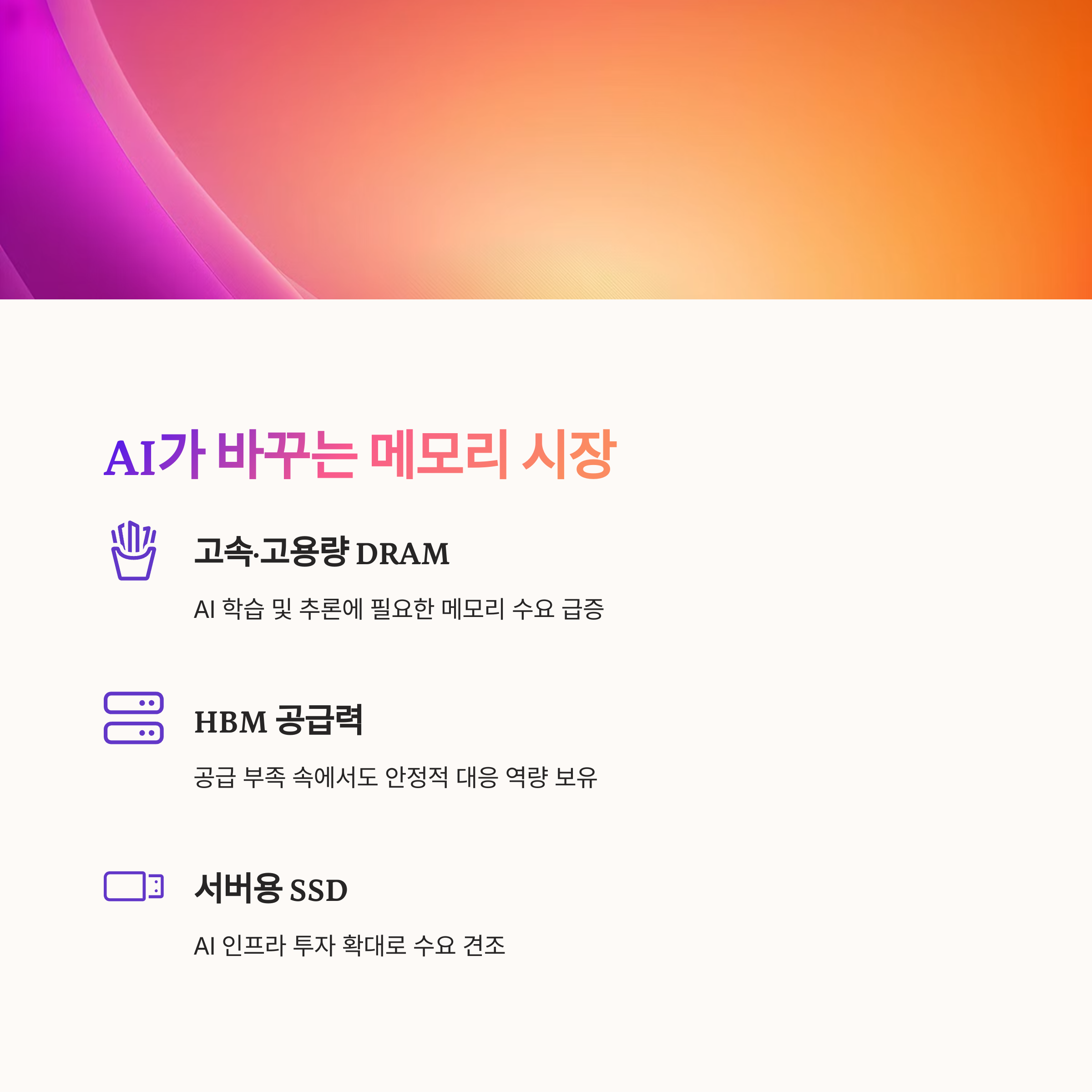 AI 기반의 대규모 모델과 서비스가 본격적으로 상용화되면서, 메모리 수요가 빠르게 증가하고 있습니다.