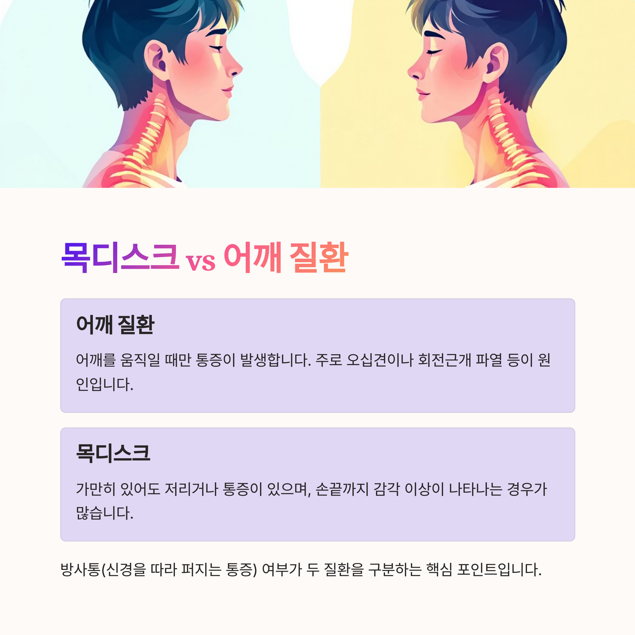 많은 사람들이 어깨 통증이 생기면 단순한 오십견이나 회전근개 파열을 의심하지만, 목디스크에서도 유사한 증상이 나타납니다.