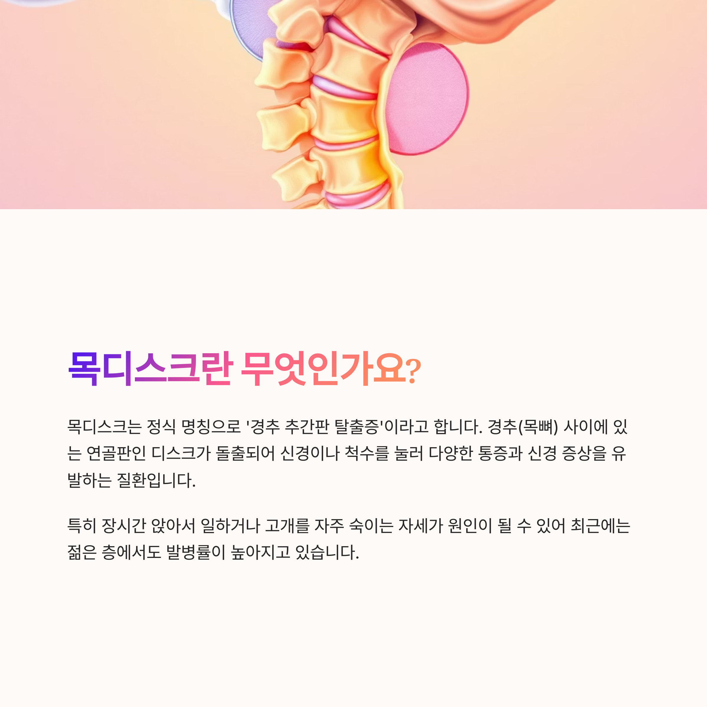 목디스크는 정식 명칭으로 '경추 추간판 탈출증'이라고 하며, 경추(목뼈) 사이에 있는 연골판인 디스크가 돌출되어 신경이나 척수를 눌러 다양한 통증과 신경 증상을 유발하는 질환입니다.