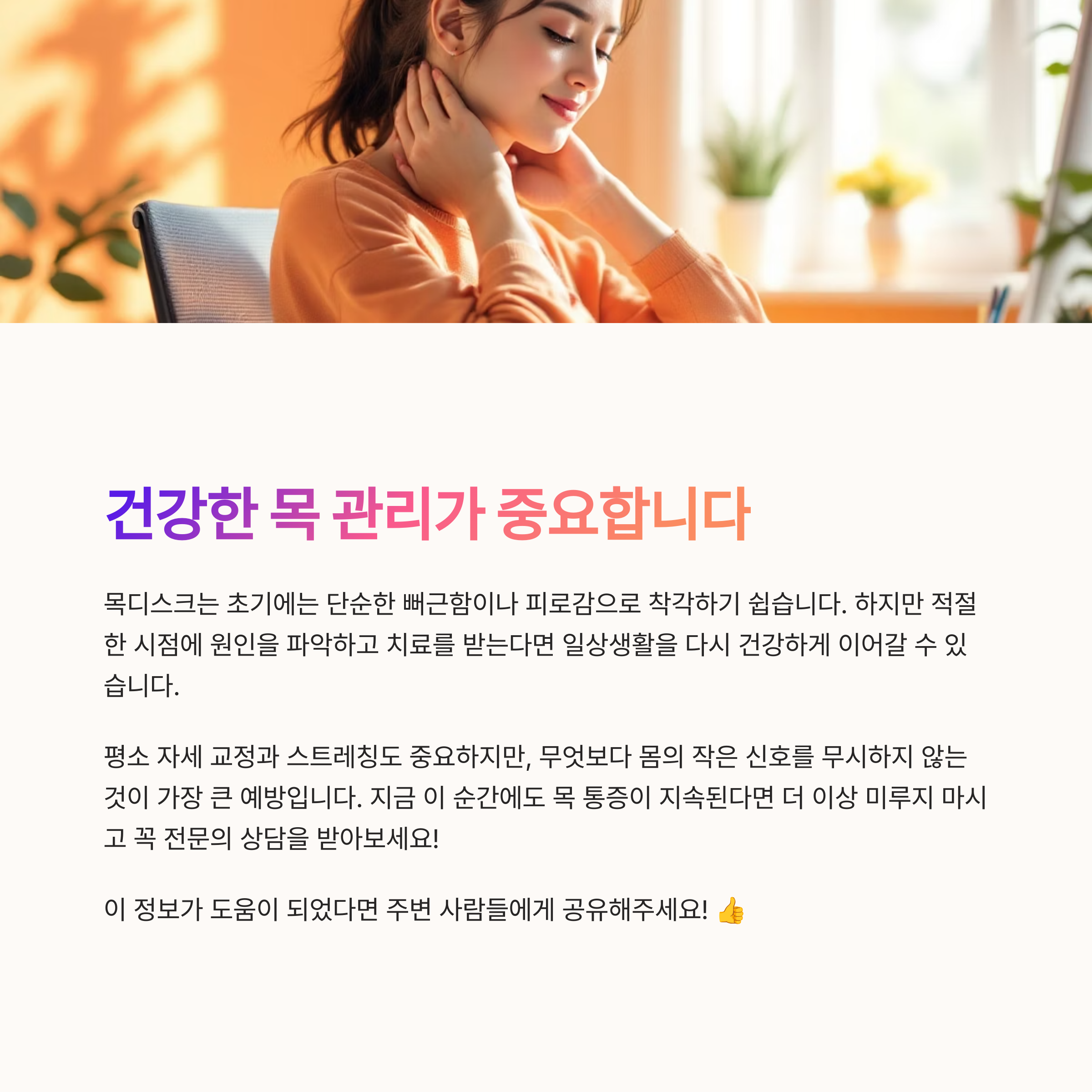 평소 자세 교정과 스트레칭도 중요하지만, 무엇보다 몸의 작은 신호를 무시하지 않는 것이 가장 큰 예방입니다.