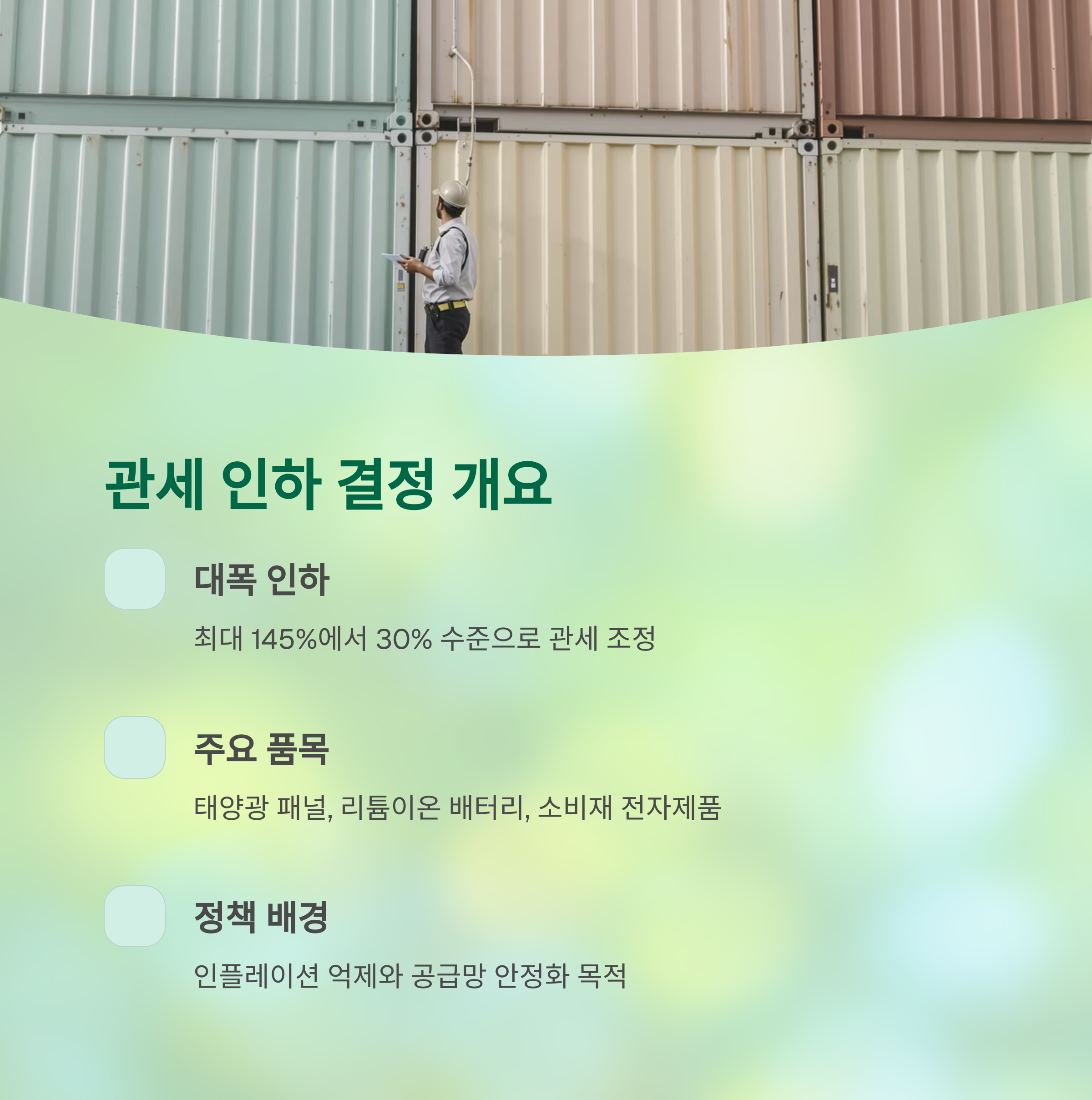 특히 태양광 패널, 리튬이온 배터리, 일부 소비재 전자제품에 대해 최대 145%에 달하던 관세를 30% 수준으로 조정한다는 것이 핵심입니다.