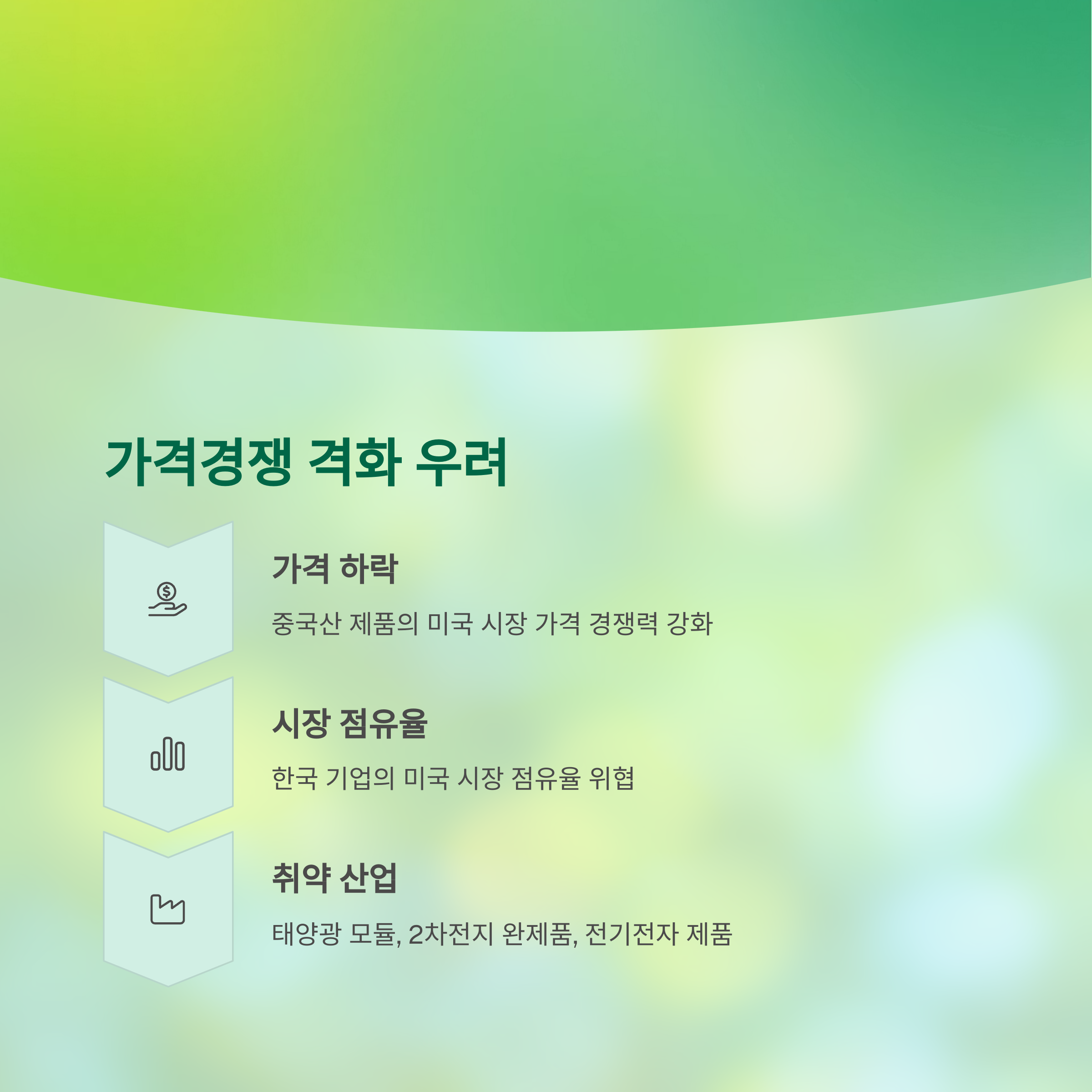 관세가 낮아지면서 중국산 제품이 미국 시장에서 더 저렴한 가격으로 공급될 수 있게 됩니다. 이는 한국 기업들이 점유하고 있던 일부 시장을 중국에 빼앗길 가능성을 높입니다. 특히 태양광 모듈, 2차전지 완제품, 일부 전기전자 제품은 이미 중국과의 단가 경쟁이 치열한 상황이었기 때문에 이번 조치는 부담 요인으로 작용할 수 있습니다.