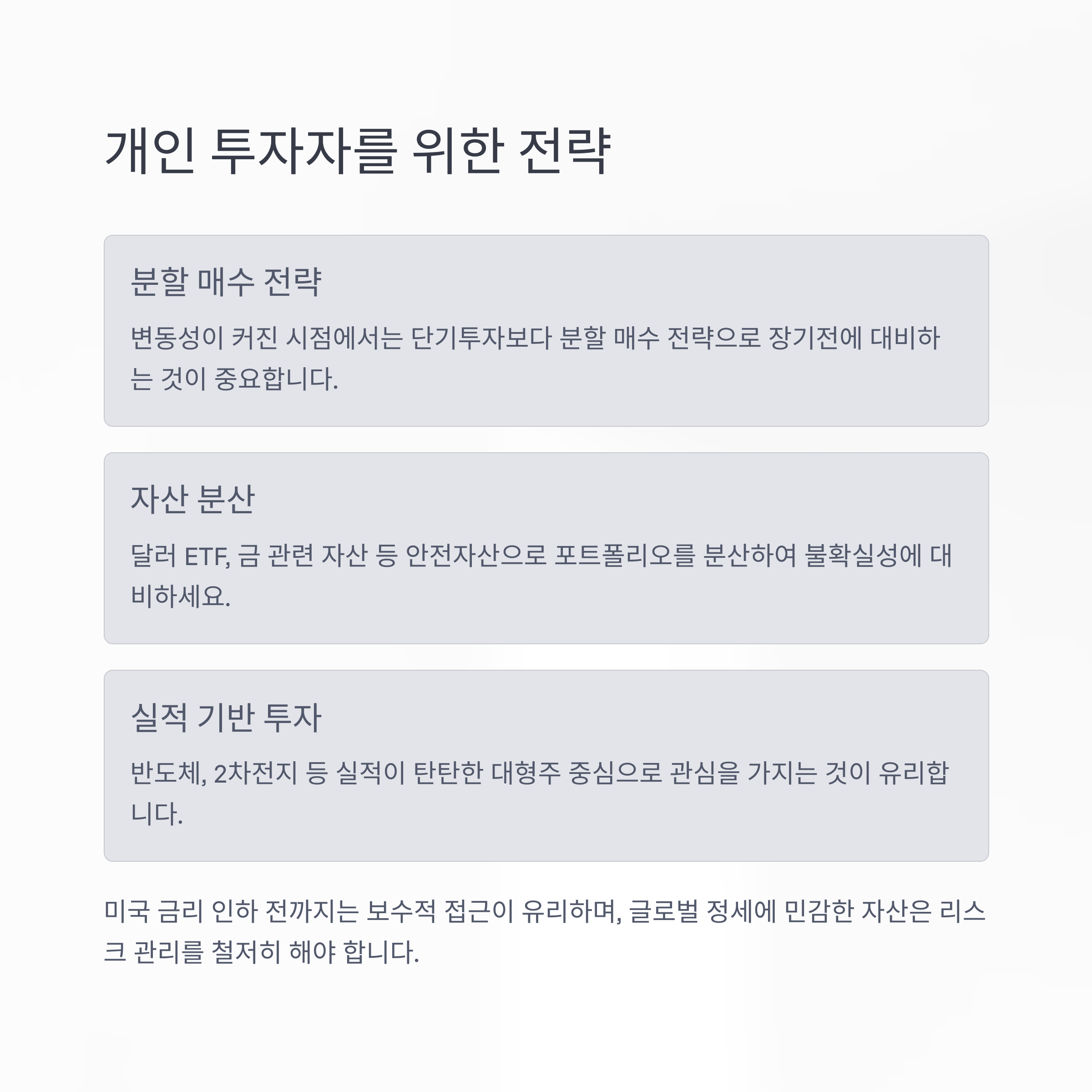 단기 매수보다 분할매수, 실적 기반 대형주 위주 접근이 안정적일 수 있습니다.