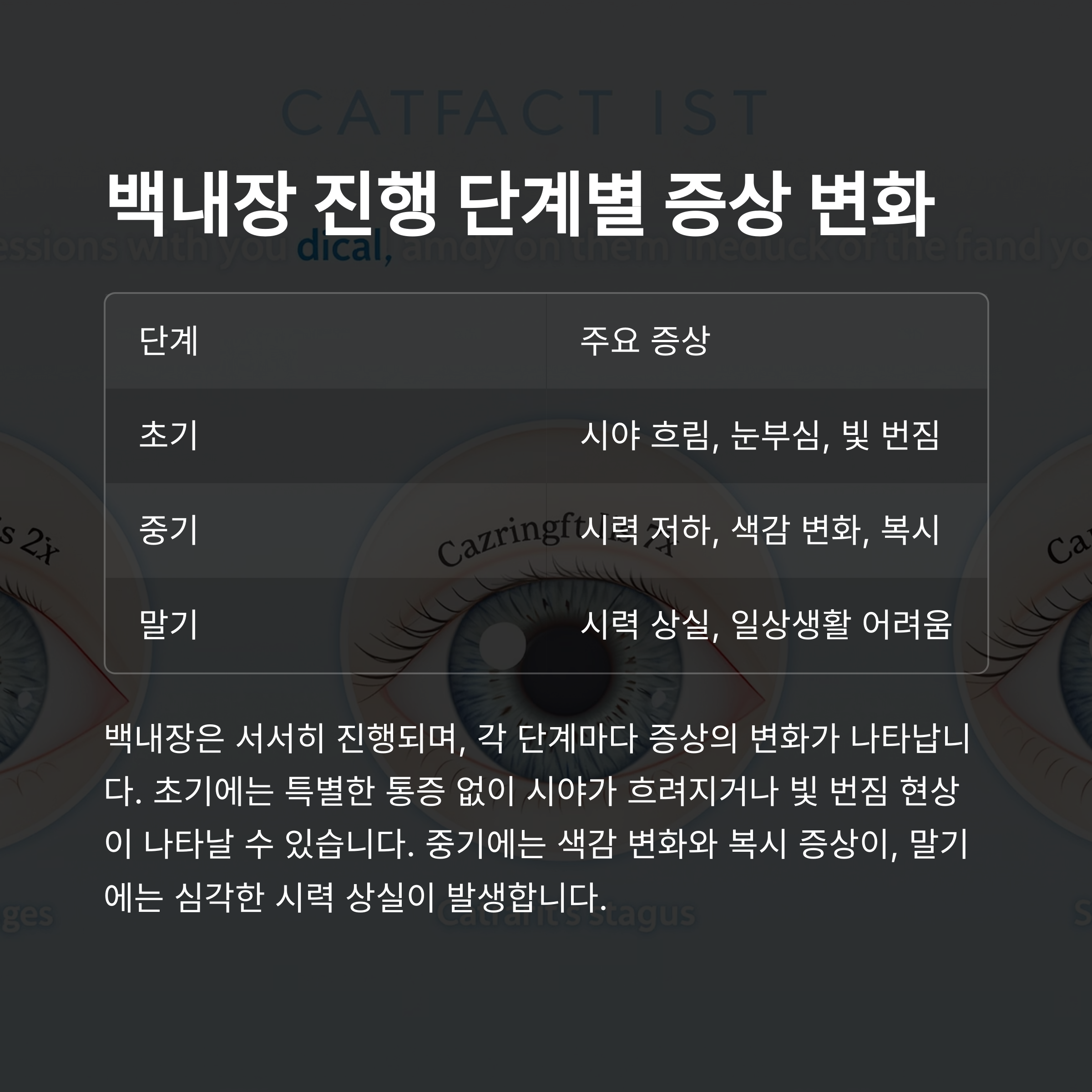 백내장은 서서히 진행되며, 각 단계마다 증상의 변화가 나타납니다. 아래 표는 백내장의 진행 단계별 주요 증상을 정리한 것입니다.