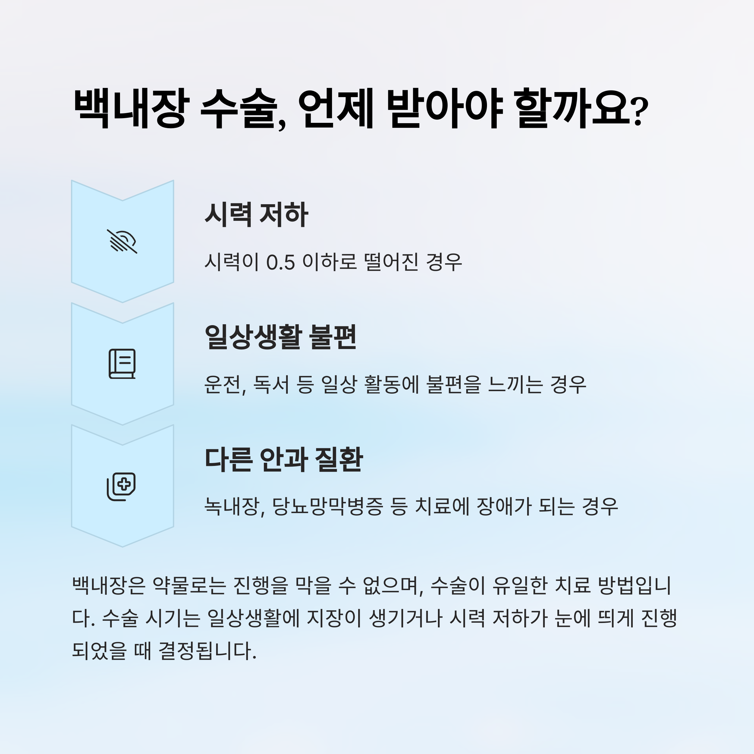수술 시기는 일상생활에 지장이 생기거나 시력 저하가 눈에 띄게 진행되었을 때 결정됩니다.